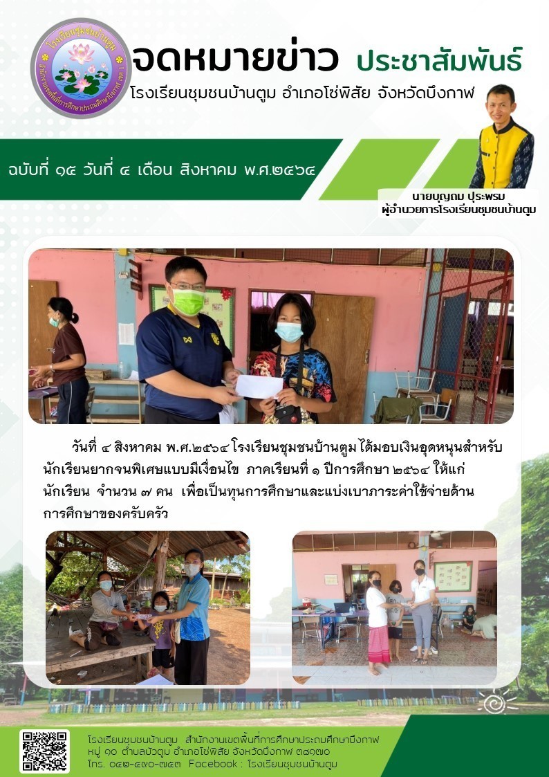 โรงเรียนชุมชนบ้านตูม ได้มอบเงินอุดหนุนสำหรับนักเรียนยากจนพิเศษแบบมีเงื่อนไข ภาคเรียนที่ ๑ ปีการศึกษา ๒๕๖๔