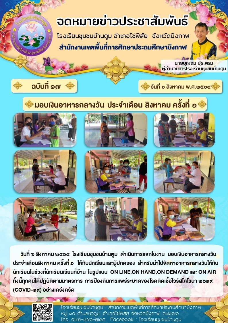 โรงเรียนชุมชนบ้านตูม ดำเนินการแจกใบงาน มอบเงินอาหารกลางวัน ให้กับนักเรียนและผู้ปกครอง ประจำเดือน สิงหาคม 2564 ครั้งที่ 1