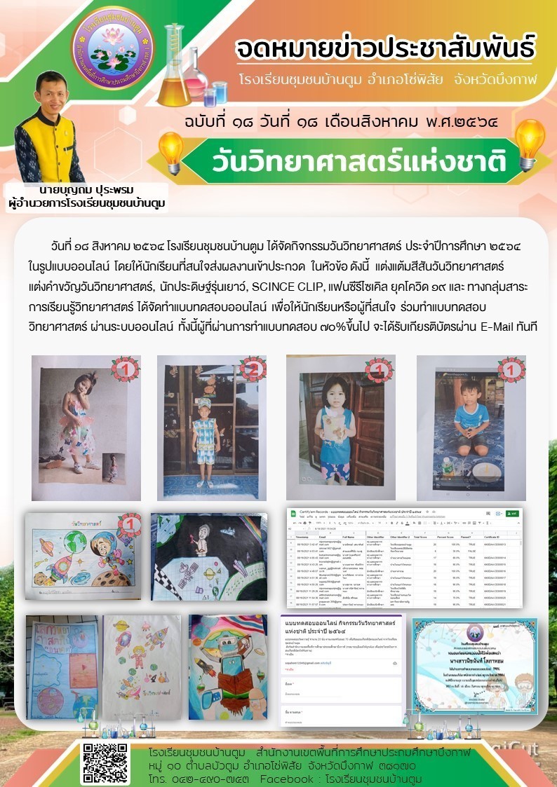 โรงเรียนชุมชนบ้านตูม ได้จัดกิจกรรมวันวิทยาศาสตร์ ประจำปีการศึกษา ๒๕๖๔ ในรูปแบบออนไลน์