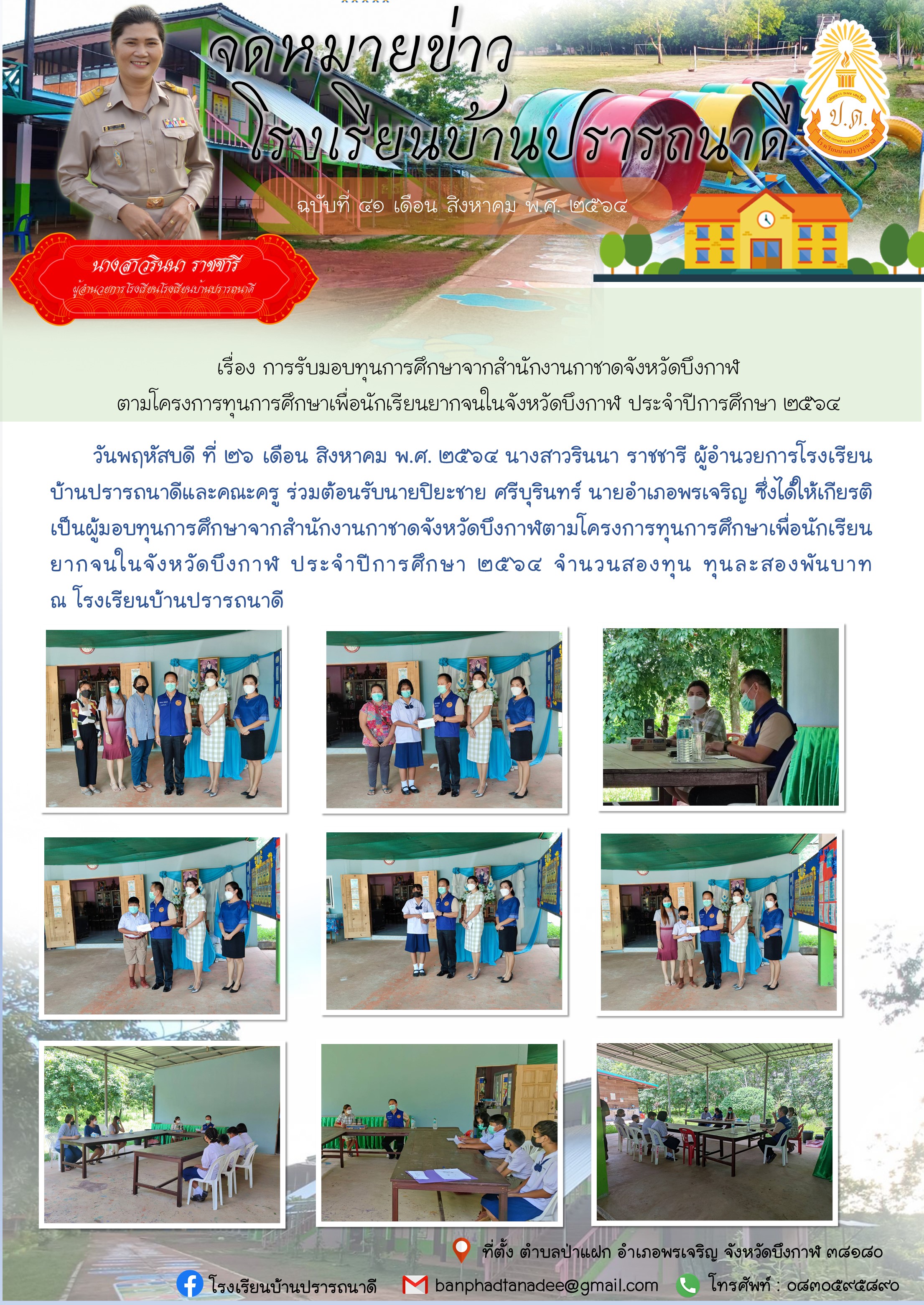 จดหมายข่าว โรงเรียนบ้านปรารถนาดี เรื่องการรับมอบทุนการศึกษาจากสำนักงานกาชาดจังหวัดบึงกาฬตามโครงการทุนการศึกษาเพื่อนักเรียนยากจนในจังหวัดบึงกาฬ ประจำปีการศึกษา ๒๕๖๔