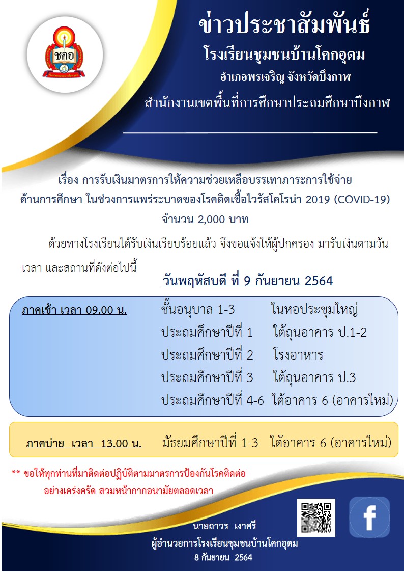 โรงเรียนชุมชนบ้านโคกอุดม โดยท่าน ผอ.ถาวร เงาศรี ได้ดำเนินการตามนโยบายของกระทรวงศึกษาธิการ ตามมาตรการให้ความช่วยเหลือบรรเทาภาระค่าใช้จ่ายด้านการศึกษาให้แก่นักเรียนและผู้ปกครอง ด้วยการจ่ายเงินเยียวยานักเรียนคนละ 2,000 บาท
