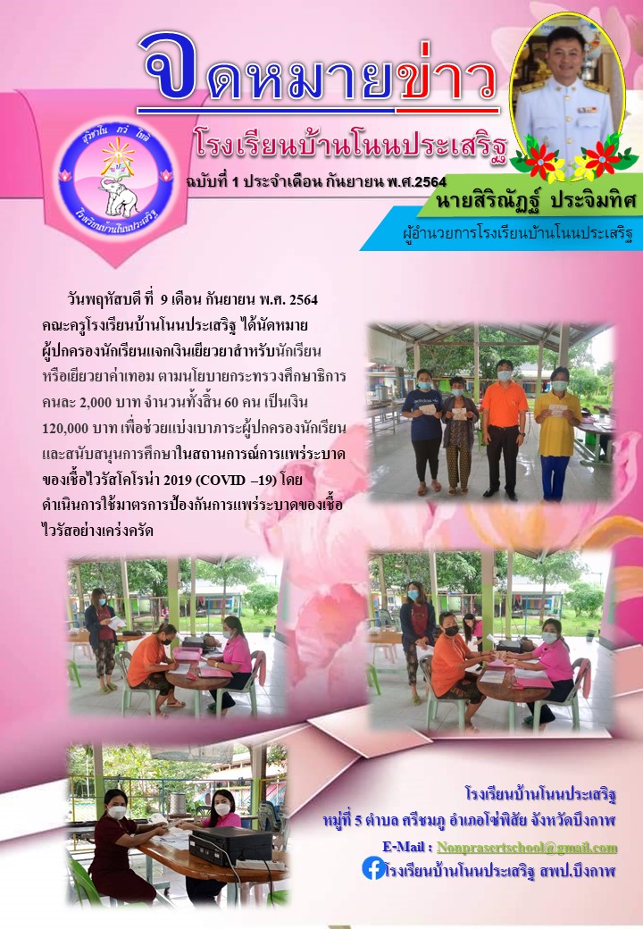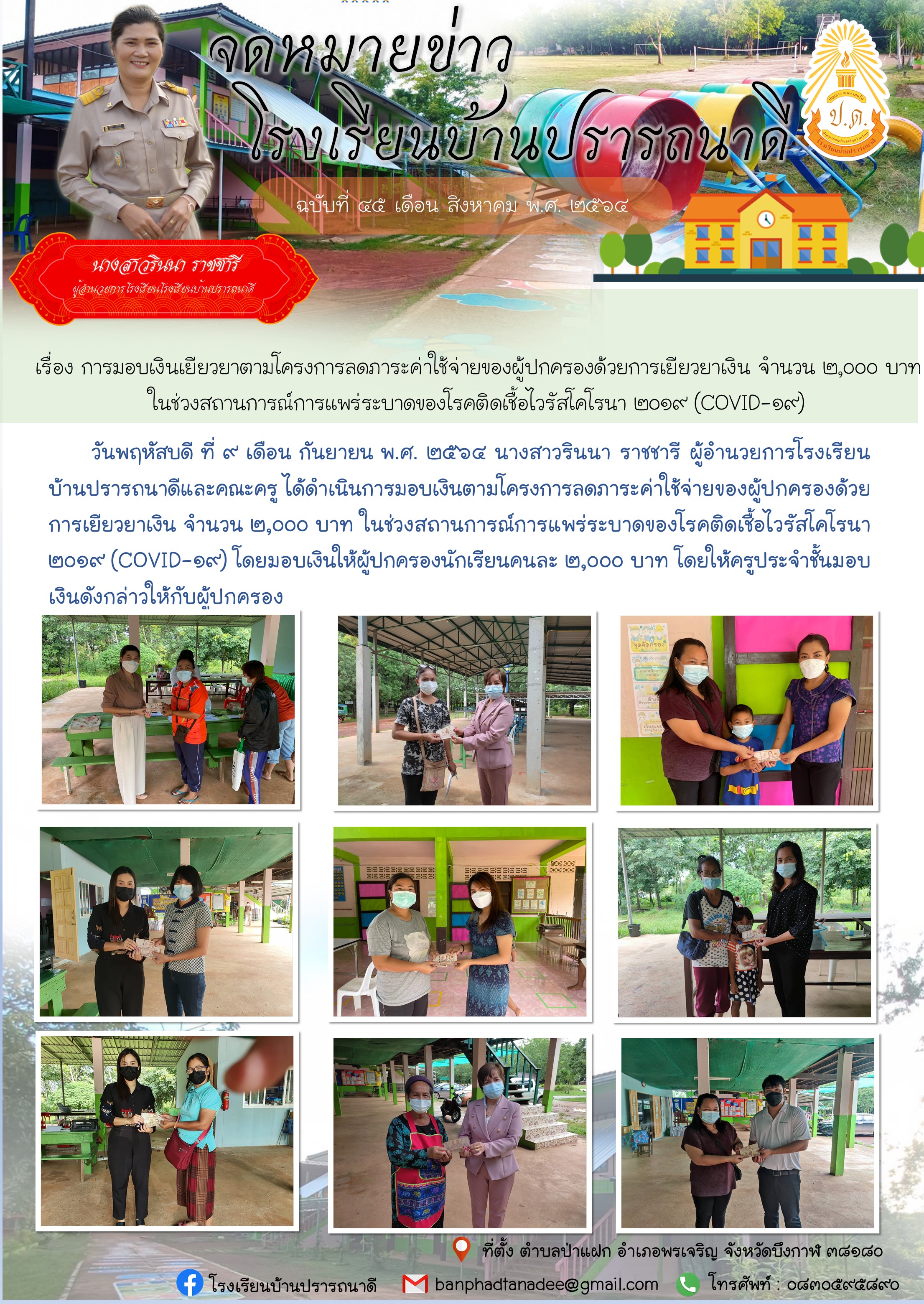 จดหมายข่าว โรงเรียนบ้านปรารถนาดีเรื่อง การมอบเงินเยียวยาตามโครงการลดภาระค่าใช้จ่ายของผู้ปกครองด้วยการเยียวยาเงิน จำนวน ๒,๐๐๐ บาท ในช่วงสถานการณ์การแพร่ระบาดของโรคติดเชื้อไวรัสโคโรนา ๒๐๑๙ (COVID-๑๙)