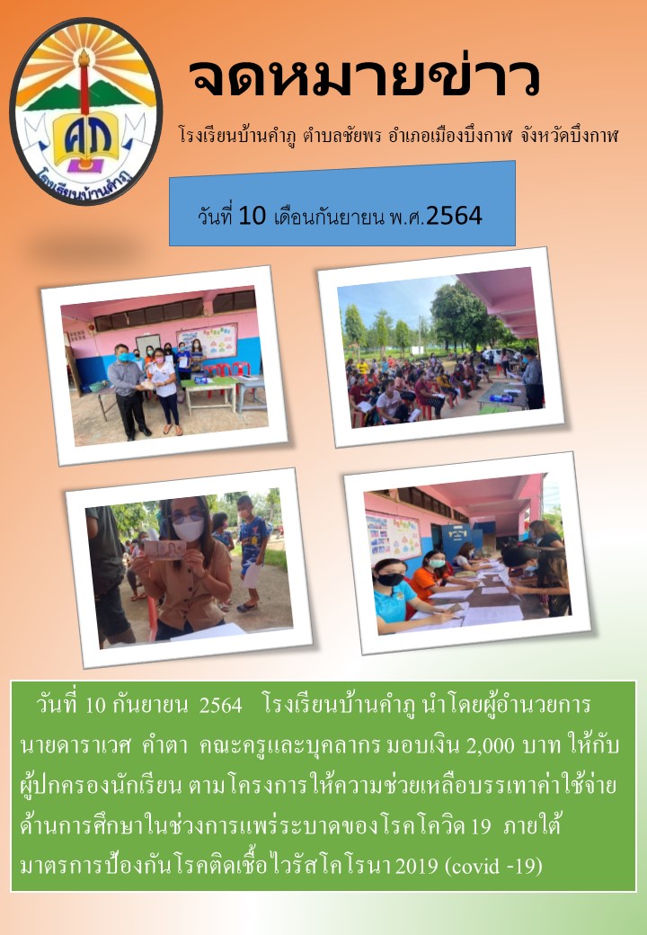 นายดาราเวศ คำตา ผู้อำนวยการโรงเรียนบ้านคำภูพร้อมคณะครู มอบเงินเยียวยาตามโครงการลดภาระค่าใช้จ่ายของผู้ปกครองด้วยการเยียวยาเงิน จำนวน ๒,๐๐๐ บาท ในช่วงสถานการณ์การแพร่ระบาดของโรคติดเชื้อไวรัสโคโรนา ๒๐๑๙ (COVID-๑๙)