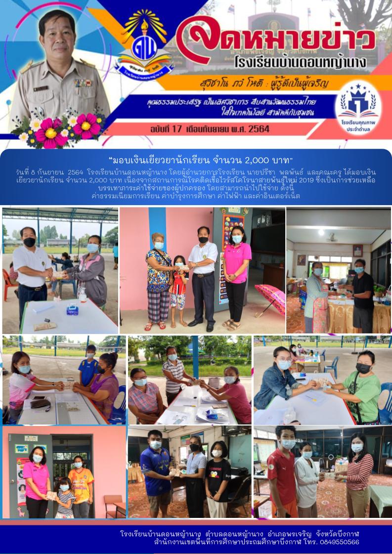 8 กันยายน 64 โรงเรียนบ้านดอนหญ้านาง ดำเนินงานตามโครงการเงินกู้เพื่อแก้ปัญหาเศรษฐกิจและสังคมจากการแพร่ระบาดของเชื้อไวรัสโคโรนา 2019 (โควิด-19) ให้แก่ผู้ปกครองนักเรียนคนละ 2,000 บาท จำนวน 278 คน 100 เปอร์เซ็น