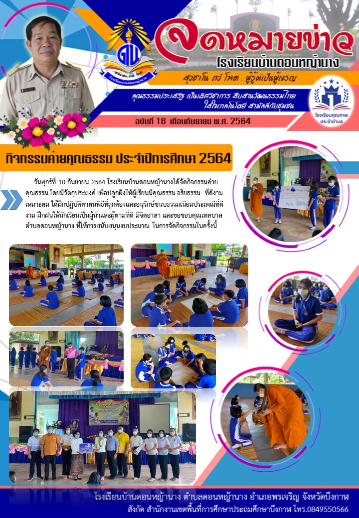 10 กันยายน 2564 โรงเรียนบ้านดอนหญ้านาง ดำเนินโครงการค่ายคุณธรรม ประจำปีการศึกษา 2564 ได้รับการสนับสนุนงบประมาณจากเทศบาลตำบลดอนหญ้านาง 15,000 บาท