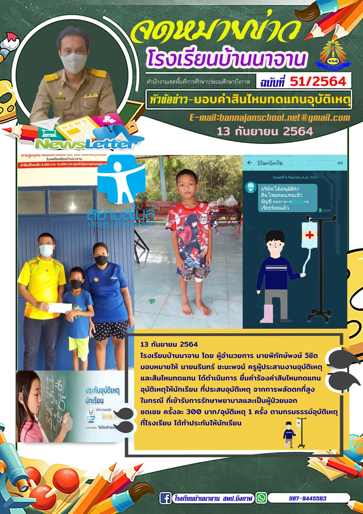 วันที่ 13 กันยายน 2564 โรงเรียนบ้านนาจาน โดย ผู้อำนวยการ นายพิทักษ์พงษ์ วิชิต มอบหมายให้ นายนรินทร์ ชะนะพจน์ ครูผู้ประสานงานอุบัติเหตุ และสินไหมทดแทน ได้ดำเนินการ ยื่นคำร้องค่าสินไหมทดแทน อุบัติเหตุให้นักเรียน ที่ประสบอุบัติเหตุ จากการพลัดตกที่สูง