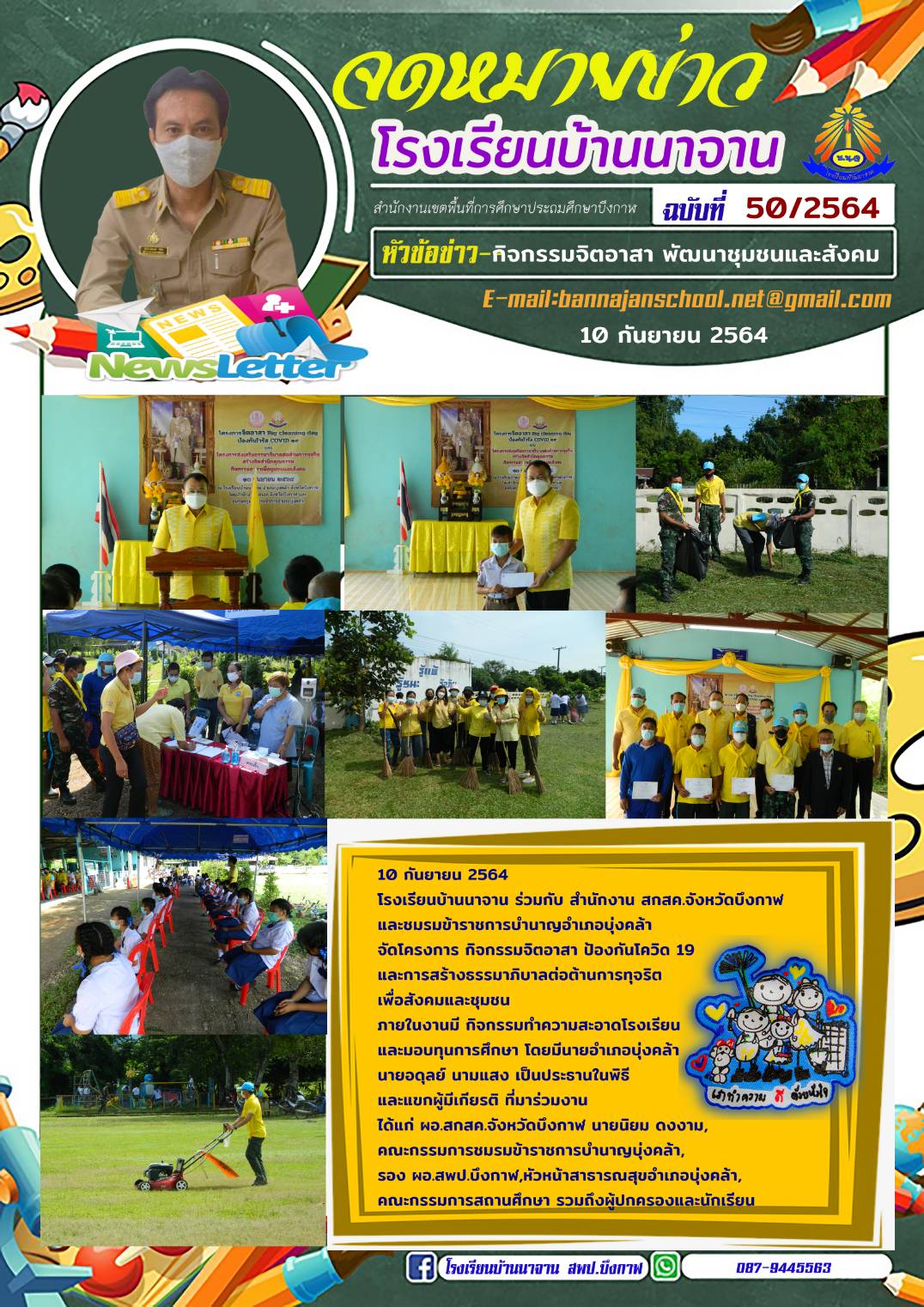 วันที่ 10 กันยายน 2564 โรงเรียนบ้านนาจาน ร่วมกับ สำนักงาน สกสค.จังหวัดบึงกาฬ และชมรมข้าราชการบำนาญอำเภอบุ่งคล้า ผู้นำชุมชน ชาวบ้านและนักเรียน ร่วมโครงการ กิจกรรมจิตอาสา ป้องกันโควิด 19 และการสร้างธรรมาภิบาลต่อต้านการทุจริต