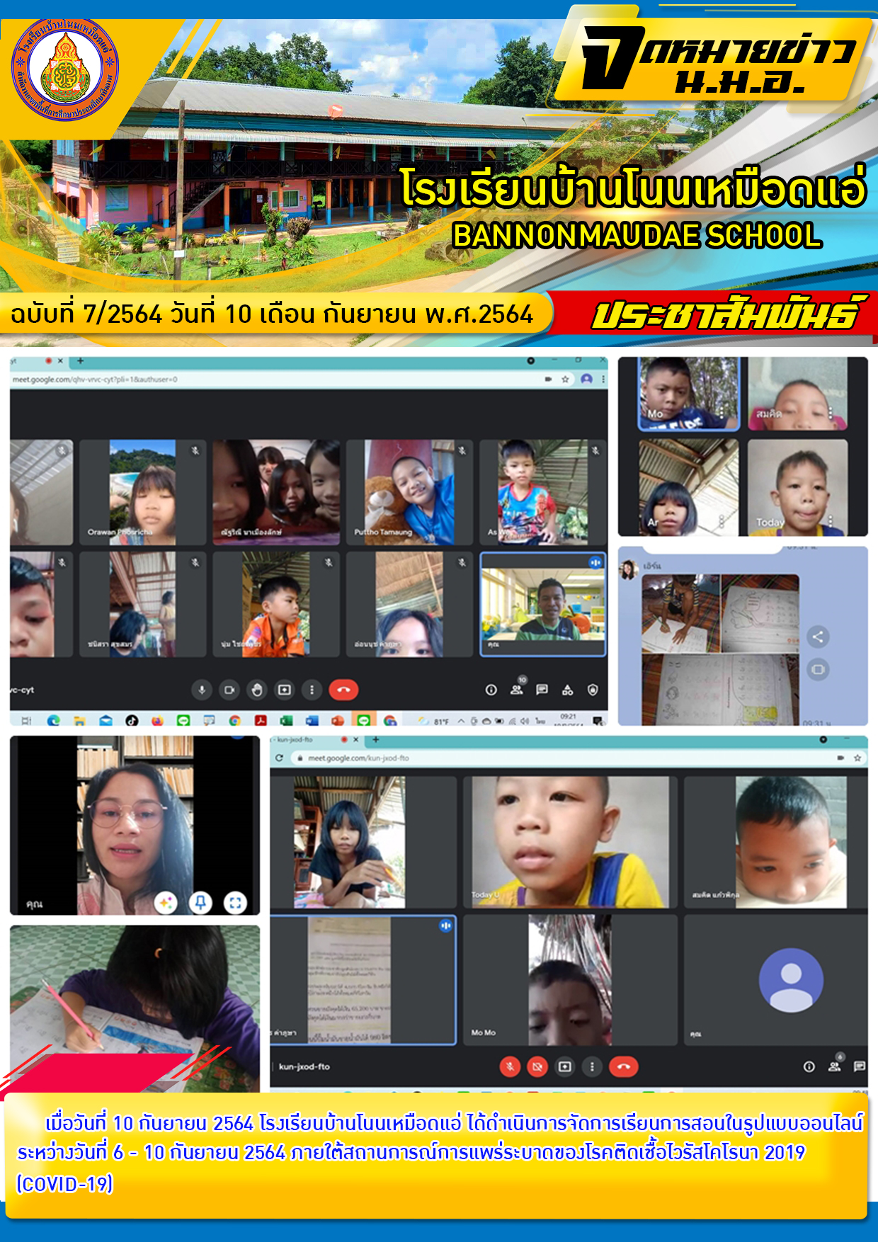 โรงเรียนบ้านโนนเหมือดแอ่ ประชาสัมพันธ์จดหมายข่าวฉบับที่ 7/2564 วันที่ 10 เดือน กันยายน พ.ศ.2564 เพื่อจัดการเรียนการสอนในรูปแบบออนไลน์ ระหว่างวันที่ 6 – 10 กันยายน 2564 ภายใต้สถานการณ์การแพร่ระบาดของโรคติดเชื้อไวรัสโคโรนา 2019 (COVID-19