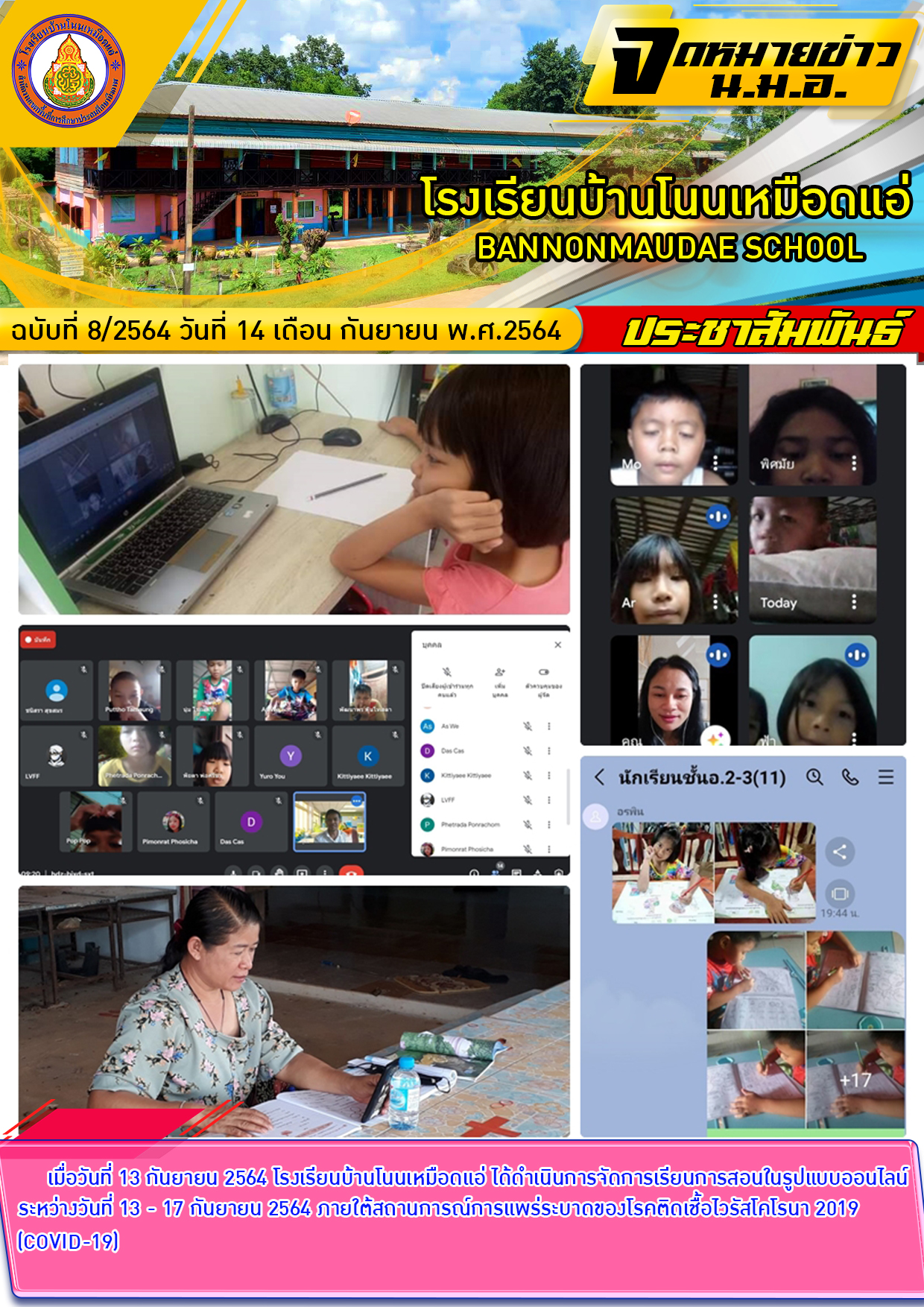 โรงเรียนบ้านโนนเหมือดแอ่ ประชาสัมพันธ์จดหมายข่าว ฉบับที่ 8/2564 วันที่ 14 เดือน กันยายน พ.ศ.2564 เพื่อจัดการเรียนการสอนในรูปแบบออนไลน์ ระหว่างวันที่ 13 – 17 กันยายน 2564 ภายใต้สถานการณ์การแพร่ระบาดของโรคติดเชื้อไวรัสโคโรนา 2019 (COVID-19)