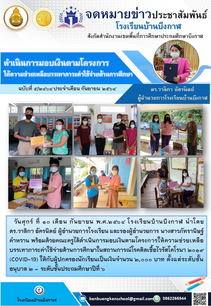 โรงเรียนบ้านบึงกาฬ มอบเงินช่วยเหลือบรรเทาภาระค่าใช้จ่ายด้านการศึกษา ในช่วงสถานการณ์ COVID-19 ในวันศุกร์ที่ 10 กันยายน 2564 (จดหมายข่าว ฉบับที่ 5 ประจำเดือนกันยายน 2564)
