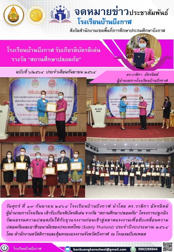 โรงเรียนบ้านบึงกาฬ เข้ารับรับเกียรติบัตรดีเด่น รางวัล "สถานศึกษาปลอดภัย" ประจำปี 2564 จากกรมสวัสดิการและคุ้มครองแรงงาน (จดหมายข่าว ฉบับที่ 6/2564 ประจำเดือนกันยายน 2564)