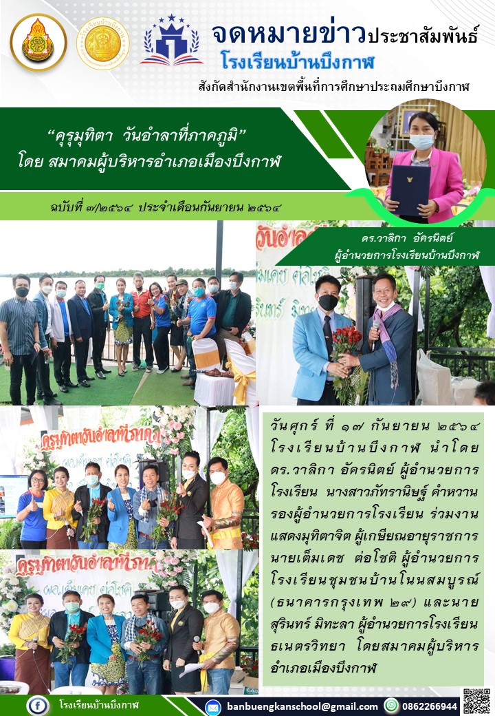 โรงเรียนบ้านบึงกาฬ ร่วมแสดงมุทิตาจิตผู้เกษียณอายุราชการ สมาชิกสมาคมผู้บริหารโรงเรียนอำเภอเมืองบึงกาฬ ในวันศุกร์ที่ 17 กันยายน 2564 (จดหมายข่าว ฉบับที่ 7/2564 ประจำเดือนกันยายน 2564)