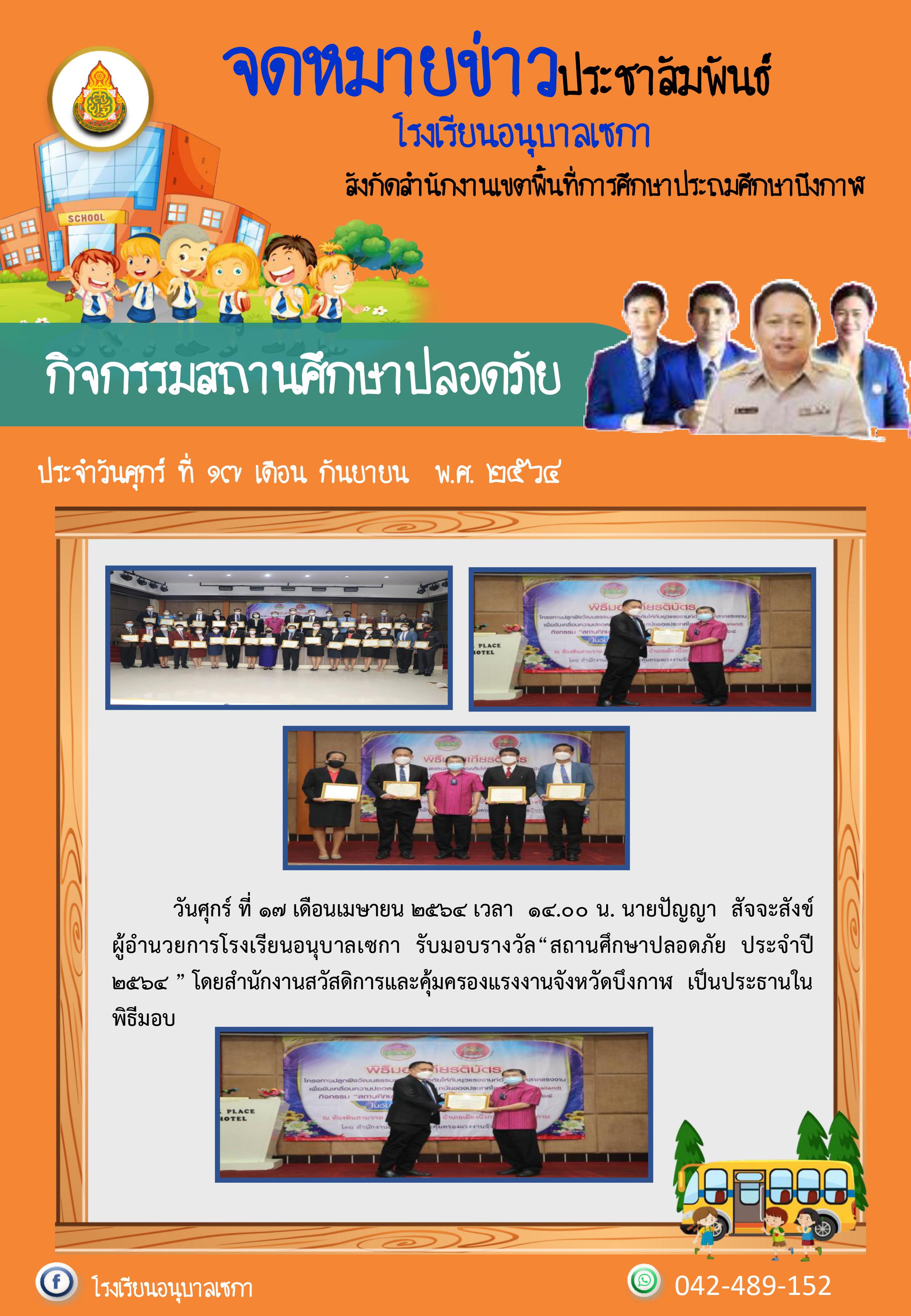 วันศุกร์ ที่ ๑๗ เดือนเมษายน ๒๕๖๔ เวลา ๑๔.๐๐ น. นายปัญญา สัจจะสังข์ผู้อำนวยการโรงเรียนอนุบาลเซกา รับมอบรางวัล“สถานศึกษาปลอดภัย ประจำปี ๒๕๖๔ ” โดยสำนักงานสวัสดิการและคุ้มครองแรงงานจังหวัดบึงกาฬ เป็นประธานในพิธีมอบ