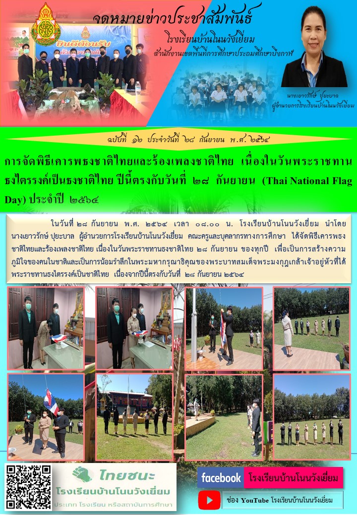 จดหมายข่าว โรงเรียนบ้านโนนวังเยี่ยม การจัดพิธีเคารพธงชาติไทยและร้องเพลงชาติไทย เนื่องในวันพระราชทานธงไตรรงค์เป็นธงชาติไทย