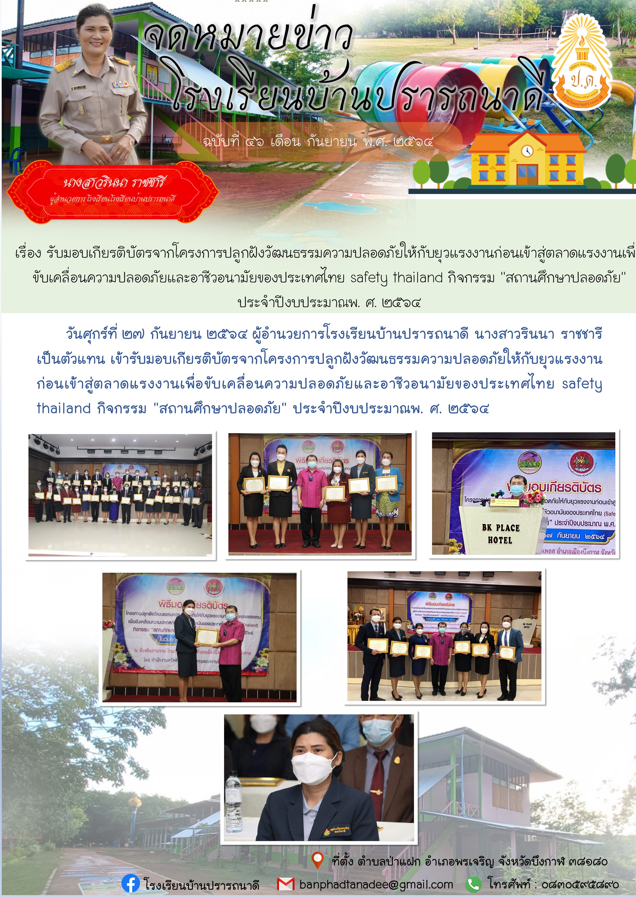 จดหมายข่าว โรงเรียนบ้านปรารถนาดี เรื่อง รับมอบเกียรติบัตรจากโครงการปลูกฝังวัฒนธรรมความปลอดภัยให้กับยุวแรงงานก่อนเข้าสู่ตลาดแรงงานเพื่อขับเคลื่อนความปลอดภัยและอาชีวอนามัยของประเทศไทย safety thailand กิจกรรม "สถานศึกษาปลอดภัย" ประจำปีงบประมาณพ. ศ. ๒๕๖๔