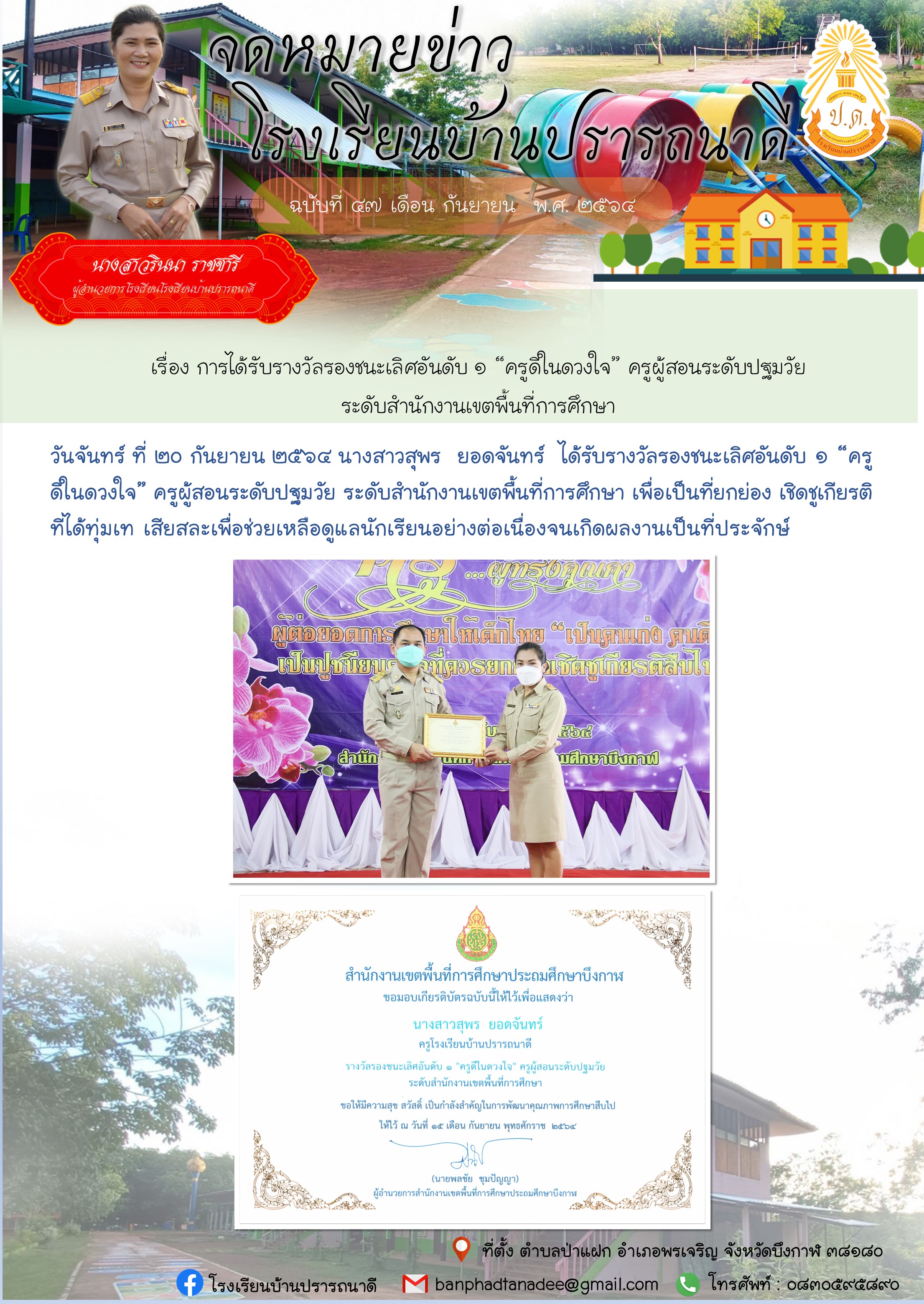 จดหมายข่าว โรงเรียนบ้านปรารถนาดี เรื่อง การได้รับรางวัลรองชนะเลิศอันดับ ๑ “ครูดีในดวงใจ” ครูผู้สอนระดับปฐมวัย ระดับสำนักงานเขตพื้นที่การศึกษา
