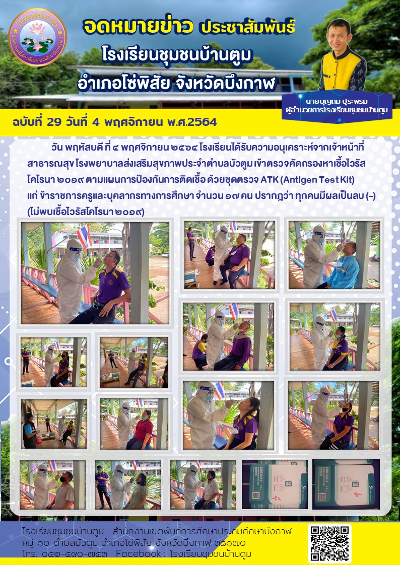 จดหมายข่าว โรงเรียนชุมชนบ้านตูม เข้าตรวจคัดกรองหาเชื้อไวรัสโคโรนา ๒๐๑๙ ตามแผนการป้องกันการติดเชื้อ ด้วยชุดตรวจ ATK (Antigen Test Kit) แก่ข้าราชการครูและบุคลากรทางการศึกษา จำนวน ๑๗ คน ปรากฎว่า ทุกคนมีผลเป็นลบ (-) (ไม่พบเชื้อไวรัสโคโรนา ๒๐๑๙)