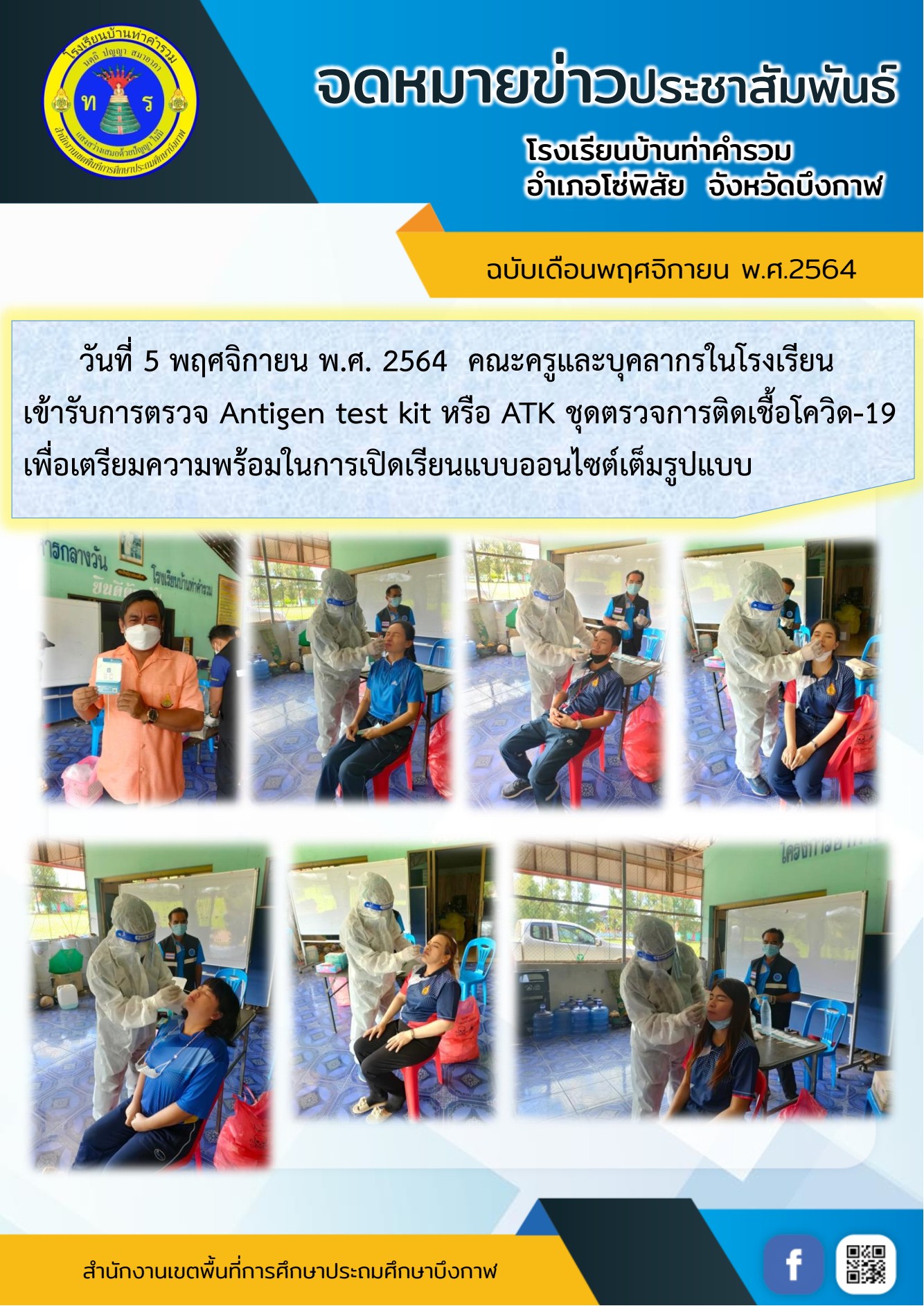การเตรียมความพร้อมในการเปิดภาคเรียนที่ 2/2564 วันที่ 5 พฤศจิกายน 2564 เจ้าหน้าที่ รพ.สต.บัวตูม เข้าตรวจเชื้อไวรัสโคโรนา 2019 (COVIT-19) ด้วยชุดตรวจ ATK ให้กับข้าราชการครูและบุคลากรโรงเรีนบ้านท่าคำรวม ทั้งหมด 11 คน ผลตรวจเป็นลบทุกคน
