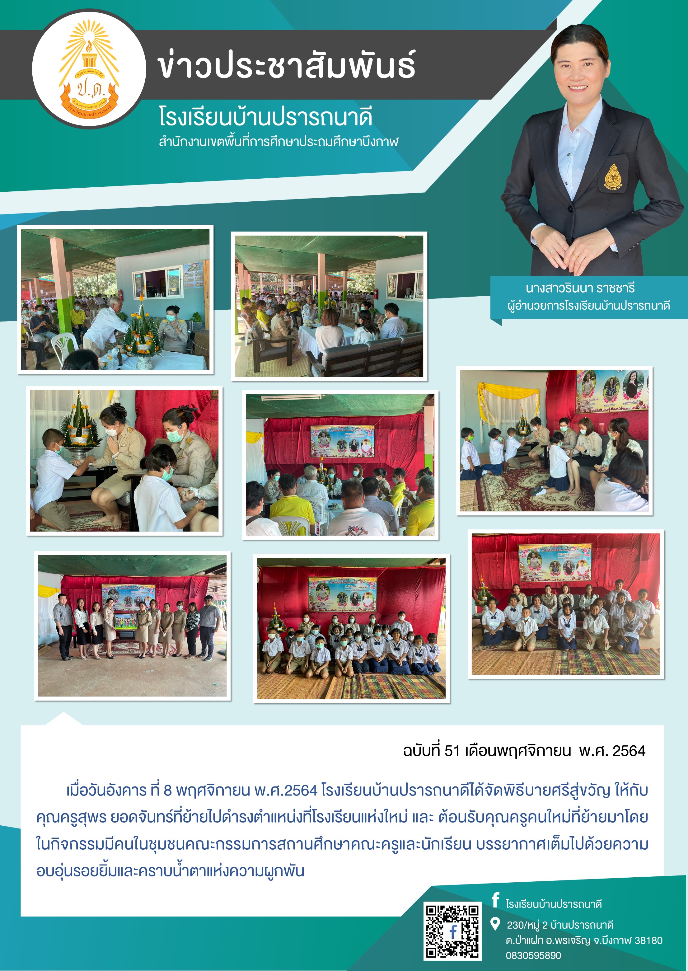 ข่าวประชาสัมพันธ์ โรงเรียนบ้านปรารถนาดี เรื่อง การจัดพิธีบายศรีสู่ขวัญ ให้กับคุณครูที่ย้ายไปดำรงตำแหน่งที่โรงเรียนแห่งใหม่ และ ต้อนรับคุณครูคนใหม่ที่ย้ายมาโรงเรียนบ้านปรารถนาดี