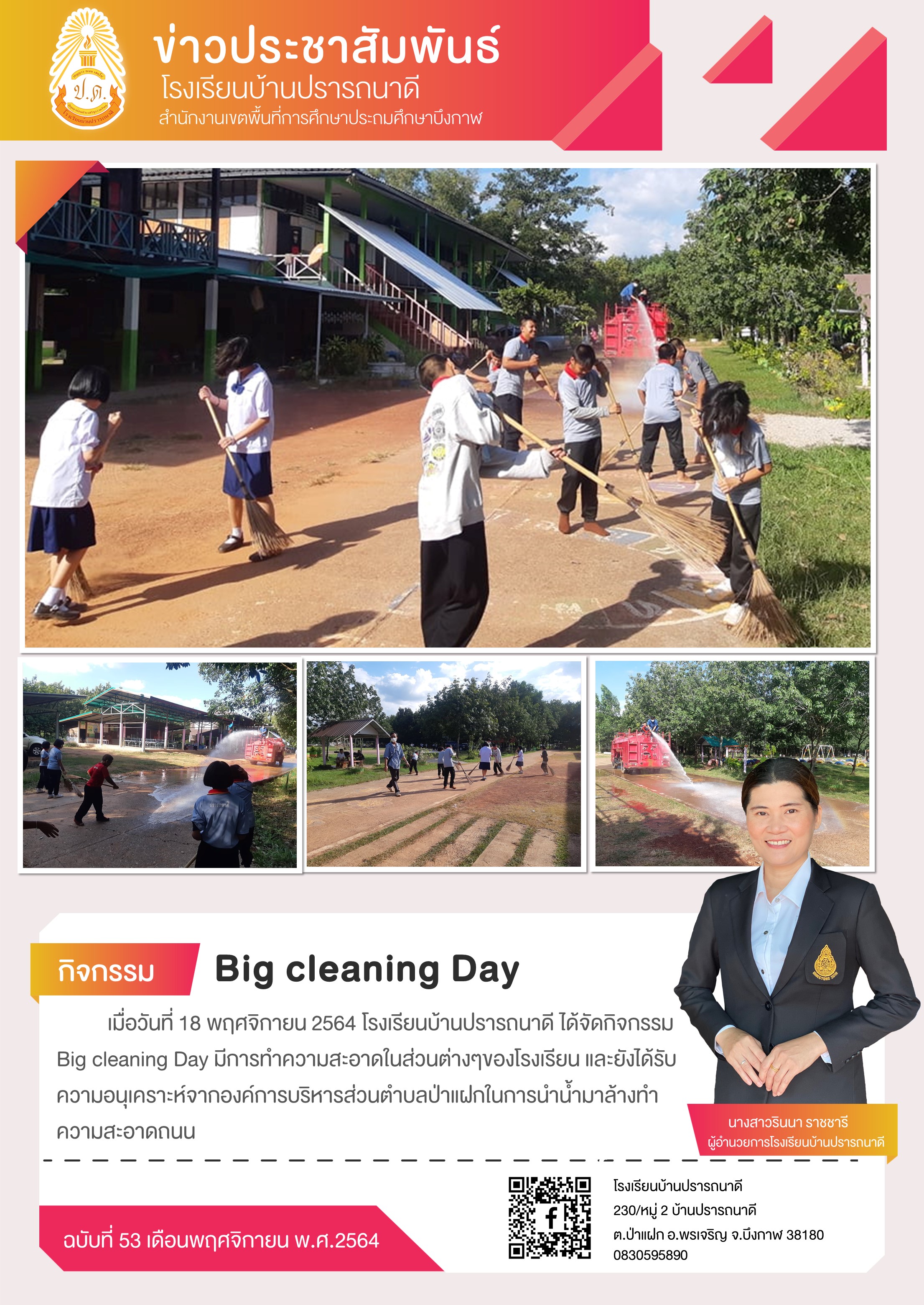 ข่าวประชาสัมพันธ์ โรงเรียนบ้านปรารถนาดี เรื่อง โรงเรียนบ้านปรารถนาดี ได้จัดกิจกรรม Big cleaning Day มีการทำความสะอาดในส่วนต่างๆของโรงเรียน และยังได้รับความอนุเคราะห์จากองค์การบริหารส่วนตำบลป่าแฝกในการทำความสะอาดถนน