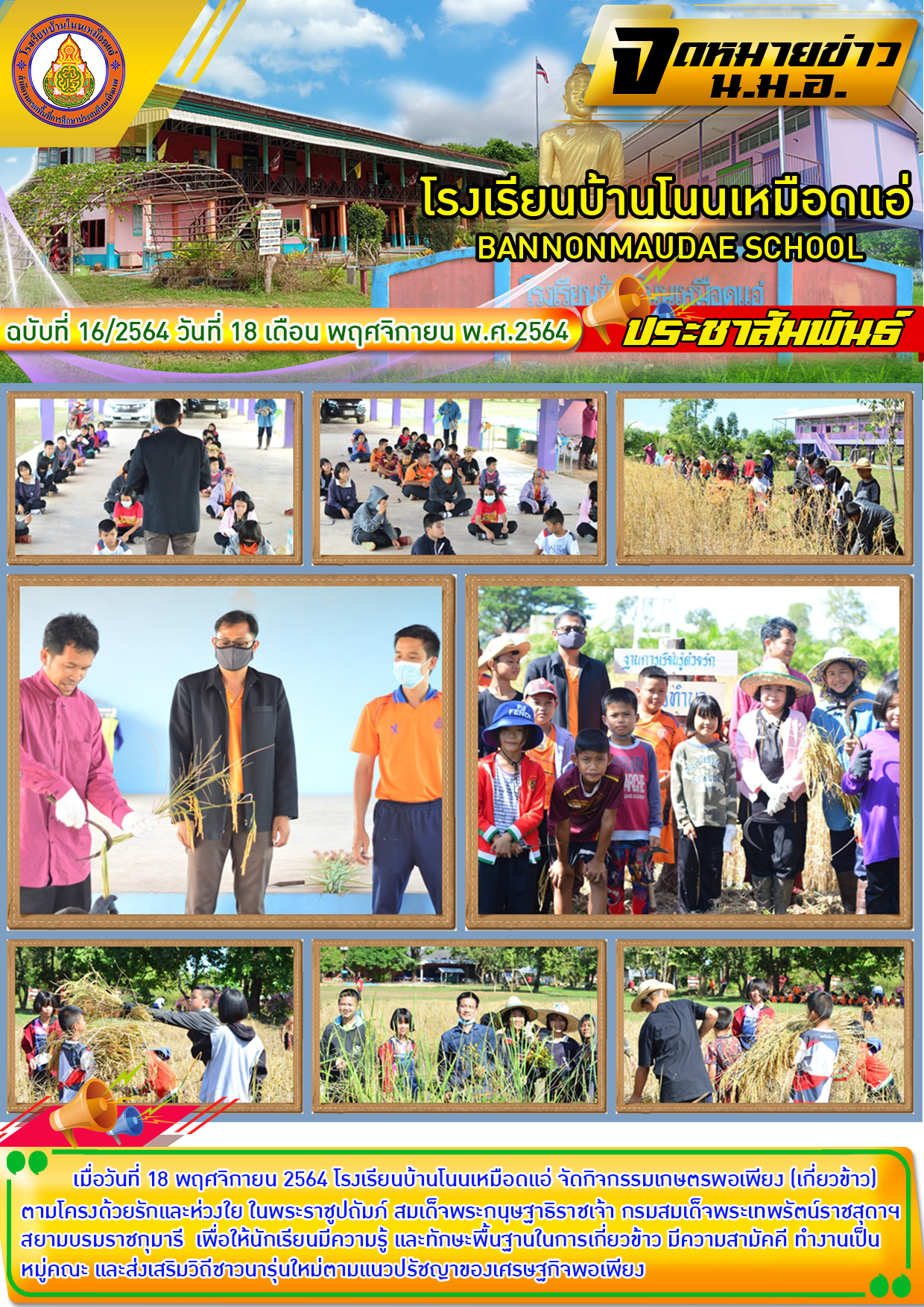 โรงเรียนบ้านโนนเหมือดแอ่ ขอประชาสัมพันธ์ จดหมายข่าว ฉบับที่ 16/2564 วันที่ 18 เดือน พฤศจิกายน พ.ศ.2564 กิจกรรมเกษตรพอเพียง (เกี่ยวข้าว) ตามโครงด้วยรักและห่วงใยฯ