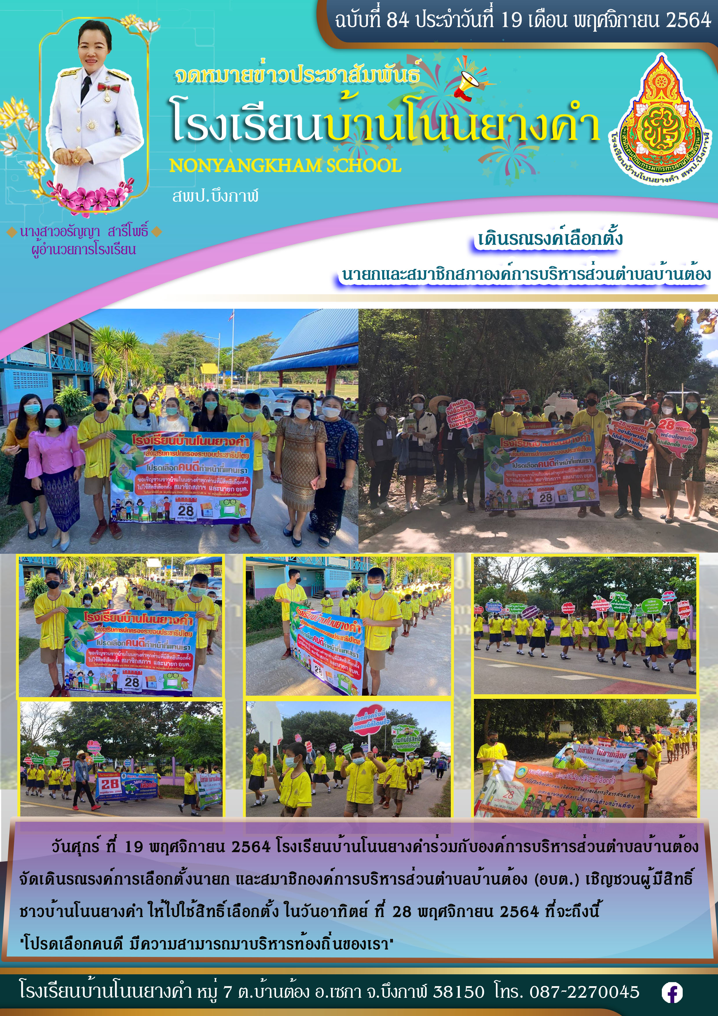 วันศุกร์ ที่ 19 พฤศจิกายน 2564 โรงเรียนบ้านโนนยางคำร่วมกับองค์การบริหารส่วนตำบลบ้านต้อง จัดเดินรณรงค์การเลือกตั้งนายก และสมาชิกองค์การบริหารส่วนตำบลบ้านต้อง (อบต.)