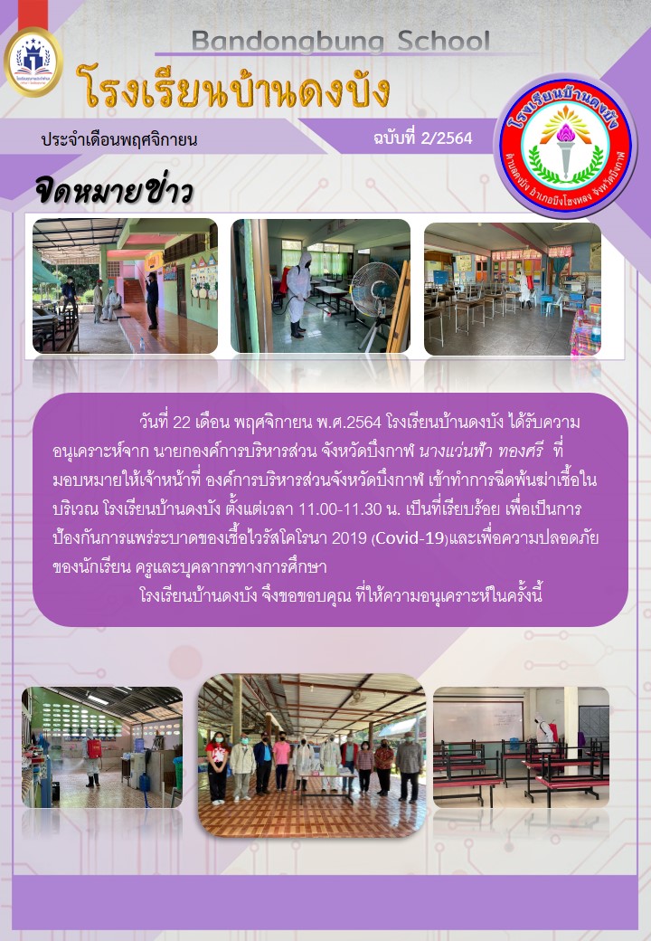 โรงเรียนบ้านดงบัง ได้รับความอนุเคราะห์จาก นายกองค์การบริหารส่วน จังหวัดบึงกาฬ นางแว่นฟ้า ทองศรี ที่มอบหมายให้เจ้าหน้าที่ องค์การบริหารส่วนจังหวัดบึงกาฬ เข้าทำการฉีดพ้นฆ่าเชื้อในบริเวณ โรงเรียนบ้านดงบัง