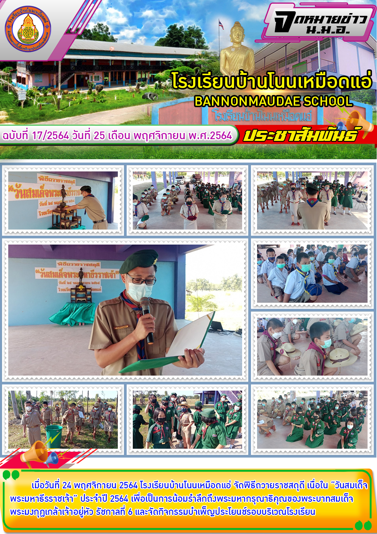โรงเรียนบ้านโนนเหมือดแอ่ ขอประชาสัมพันธ์ จดหมายข่าว ฉบับที่ 17/2564 พิธีถวายราชสดุดี เนื่องในวันสมเด็จพระมหาธีรราชเจ้า ประจำปี 2564