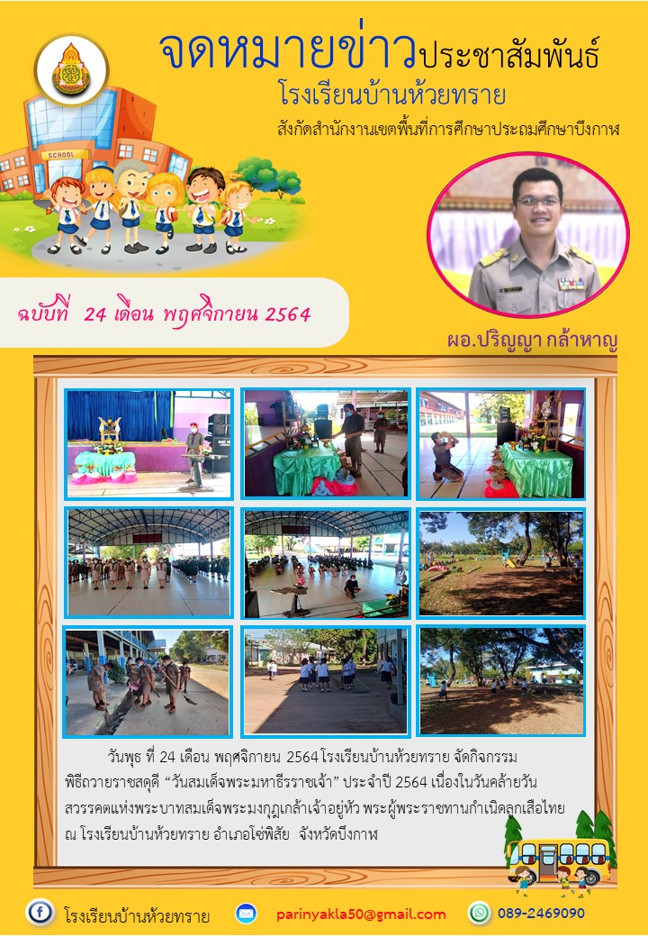 โรงเรียนบ้านห้วยทราย ขอประชาสัมพันธ์ จดหมายข่าว ฉบับที่ 24/2564 พิธีถวายราชสดุดี เนื่องในวันสมเด็จพระมหาธีรราชเจ้า ประจำปี 2564