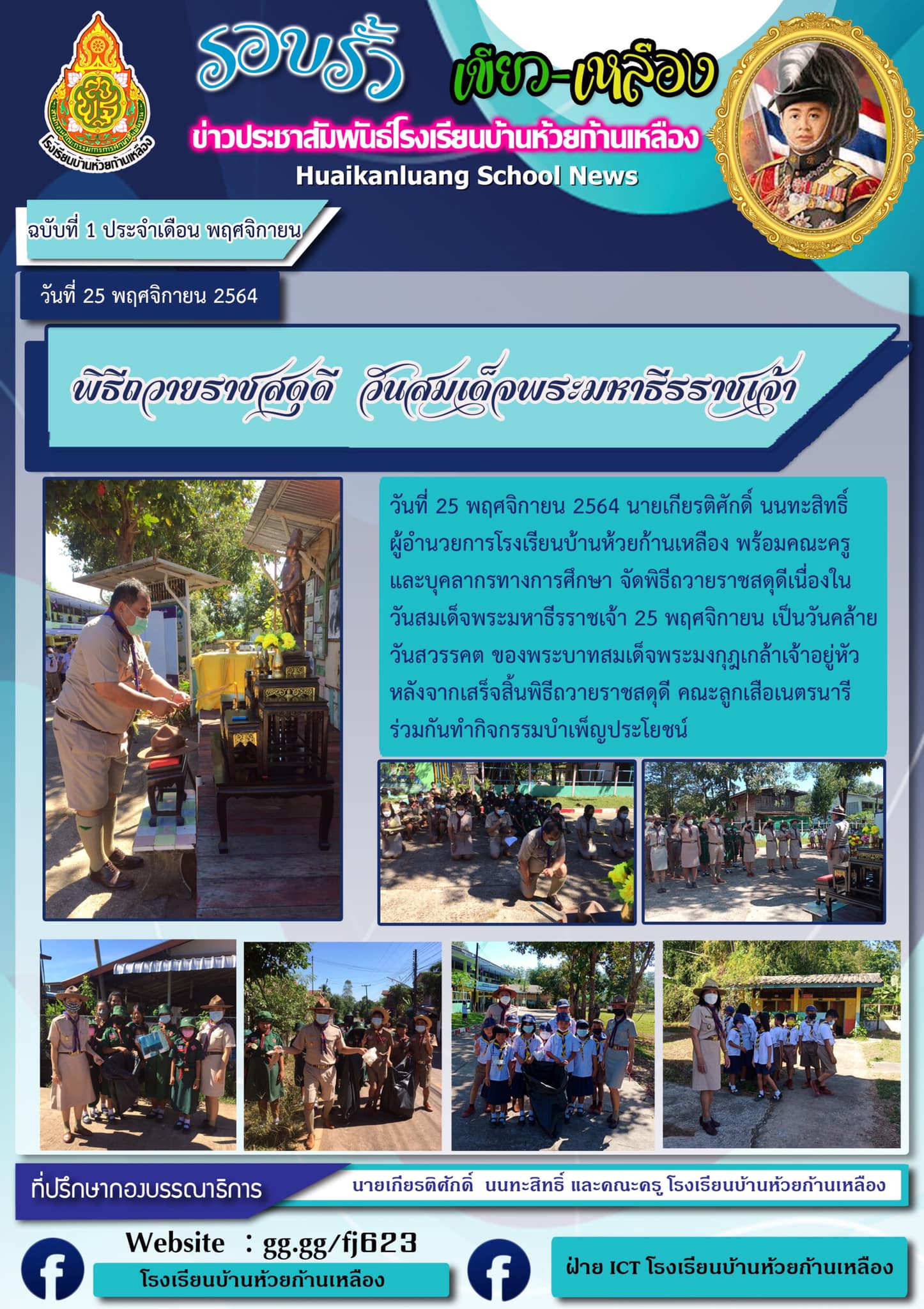 โรงเรียนบ้านห้วยก้านเหลือง ขอประชาสัมพันธ์ จดหมายข่าว ฉบับที่ 1 ประจำเดือนพฤศจิกายน เรื่องพิธีถวายราชสดุดี เนื่องในวันสมเด็จพระมหาธีรราชเจ้า ประจำปี 2564