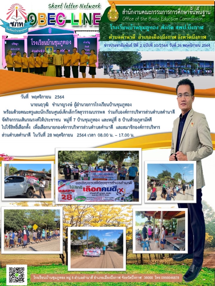 โรงเรียนบ้านชุมภูทอง นำโดยนายนฤวุฒิ ชำนาญวงษ์ ผู้อำนวยการโรงเรียนบ้านชุมภูทอง พร้อมด้วยคณะครูและนักเรียนจัดกิจกรรมเดินรณรงค์การเลือกตั้ง นายก อบต.และสมาชิก อบต.