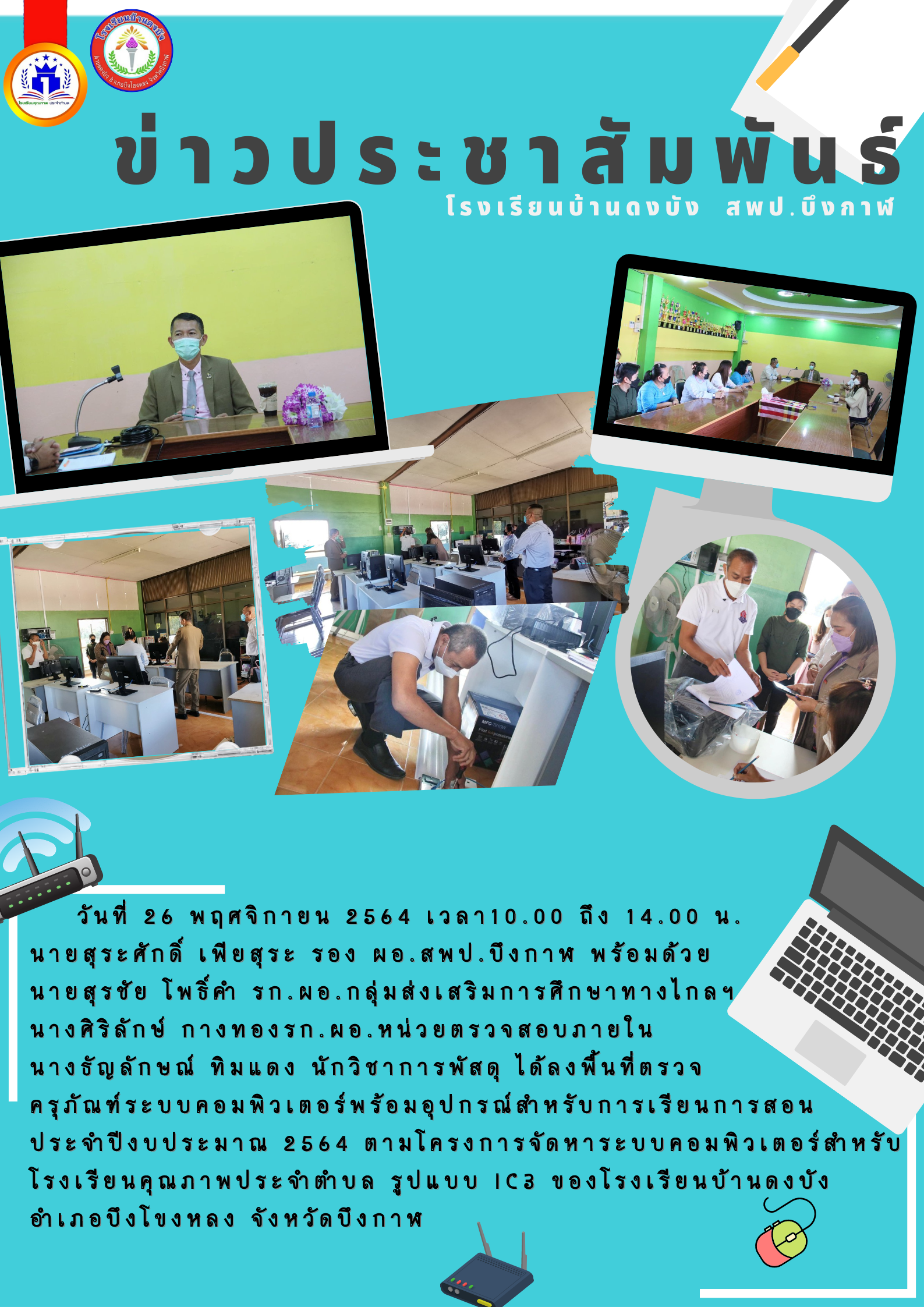 โรงเรียนบ้านดงบัง ได้รับการตรวจรับครุภัณฑ์ ระบบคอมพิวเตอร์พร้อมอุปกรณ์สำหรับการเรียนการสอน จาก ท่านสุระศักดิ์ เพียสุระ รอง ผอ.สพป.บึงกาฬ พร้อมด้วยคณะ เมื่อวันที่26พฤศจิกายน 2564