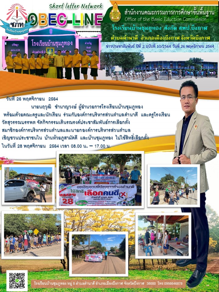 โรงเรียนบ้านชุมภูทอง นำโดย นายนฤวุฒิ ชำนาญวงษ์ ผู้อำนวยการโรงเรียนบ้านชุมภูทอง พร้อมด้วยคณะครูและบุคลากรทางการศึกษา และนักเรียน ได้จัดกิจกรรมเดินรณรงค์ประชาสัมพันธ์การเลือกตั้ง