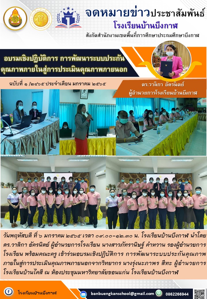 โรงเรียนบ้านบึงกาฬ อบรมเชิงปฏิบัติการการพัฒนาระบบประกันคุณภาพภายในสู่การประเมินคุณภาพภายนอก ในวันพฤหัสบดีที่ 6 มกราคม 2565 เวลา 09.00-12.30 น. ณ ห้องประชุมมหาวิทยาลัยขอนแก่น โรงเรียนบ้านบึงกาฬ