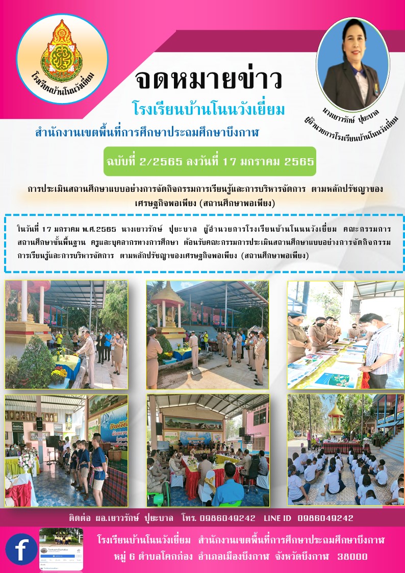 วันที่ 17 มกราคม 2565 เวลา 13.00 น. โรงเรียนบ้านโนนวังเยี่ยม ต้อนรับคณะกรรมการประเมินสถานศึกษาแบบอย่างการจัดการเรียนรู้และบริหารจัดการตามหลักปรัชญาของเศรษฐกิจพอเพียง (สถานศึกษาพอเพียง) ปี 2564