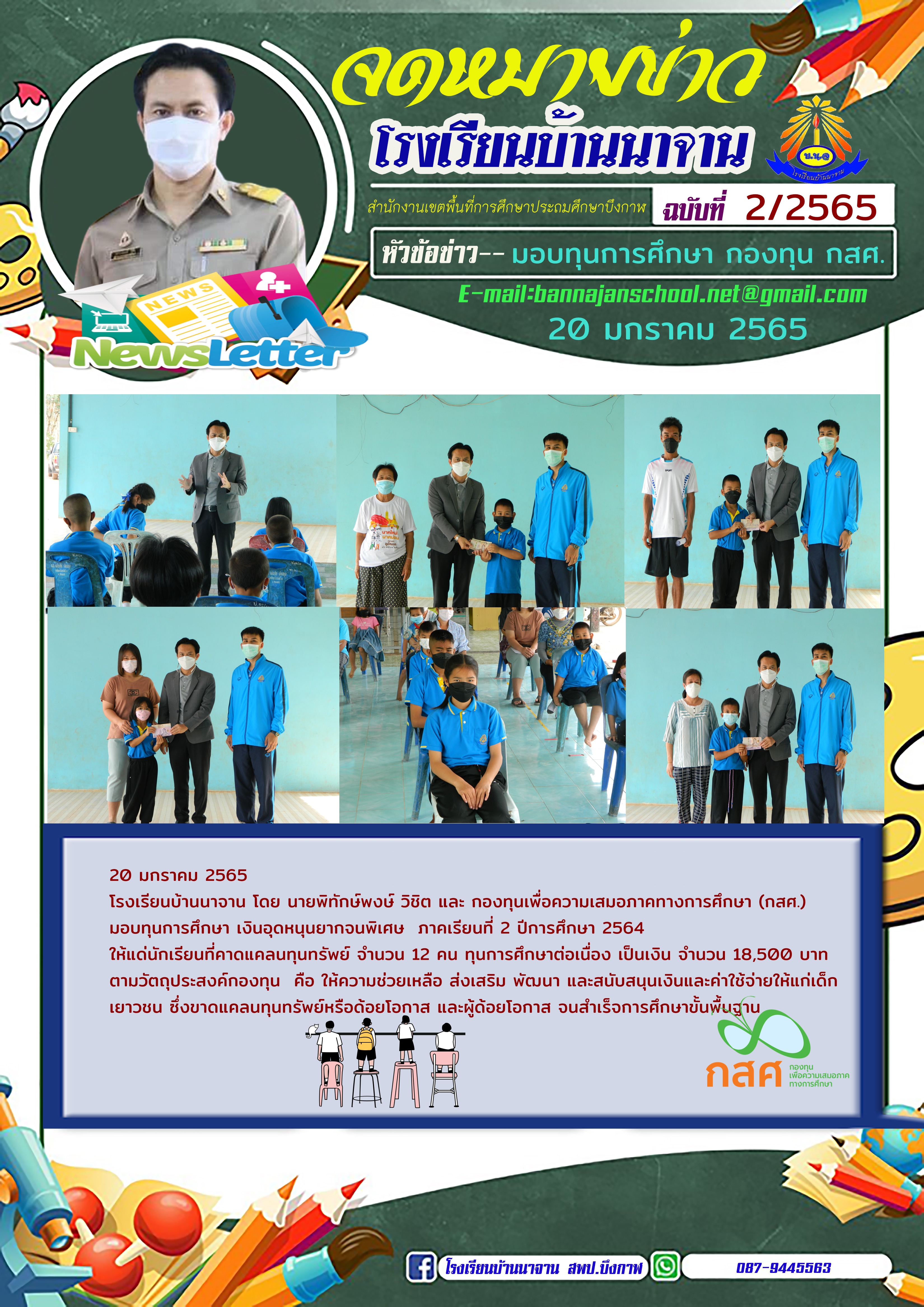 วันที่ 20 มกราคม 2565 โรงเรียนบ้านนาจาน โดย นายพิทักษ์พงษ์ วิชิต และ กองทุนเพื่อความเสมอภาคทางการศึกษา (กสศ.) มอบทุนการศึกษา เงินอุดหนุนยากจนพิเศษ ภาคเรียนที่ 2 ปีการศึกษา 2564