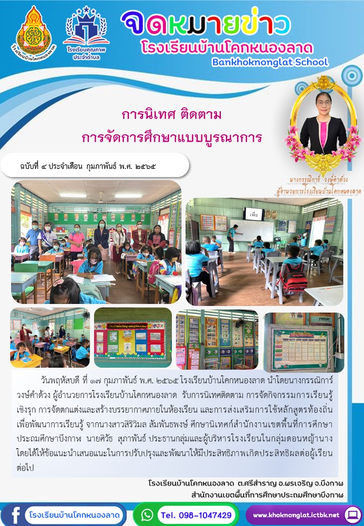 โรงเรียนบ้านโคกหนองลาด ประชาสัมพันธ์การนิเทศการจัดการเรียนรู้เชิงรุก Active Learning การจัดตกแต่งและสร้างบรรยากาศในห้องเรียน การส่งเสริมการใช้หลักสูตรท้องถิ่นเพื่อพัฒนาการเรียนรู้ เมื่อวันที่ 17 กุมภาพันธ์ 2565
