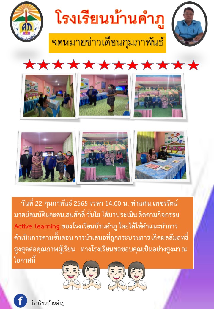 วันที่ 22 กุมภาพันธ์ 2565 ศน.เพรรรัตน์ มาตย์สมบัติและ ศน.สมศักดิ์ วันโย ได้มาประเมิน ติดตามกิจกรรม Active learning ของโรงเรียนบ้านคำภู