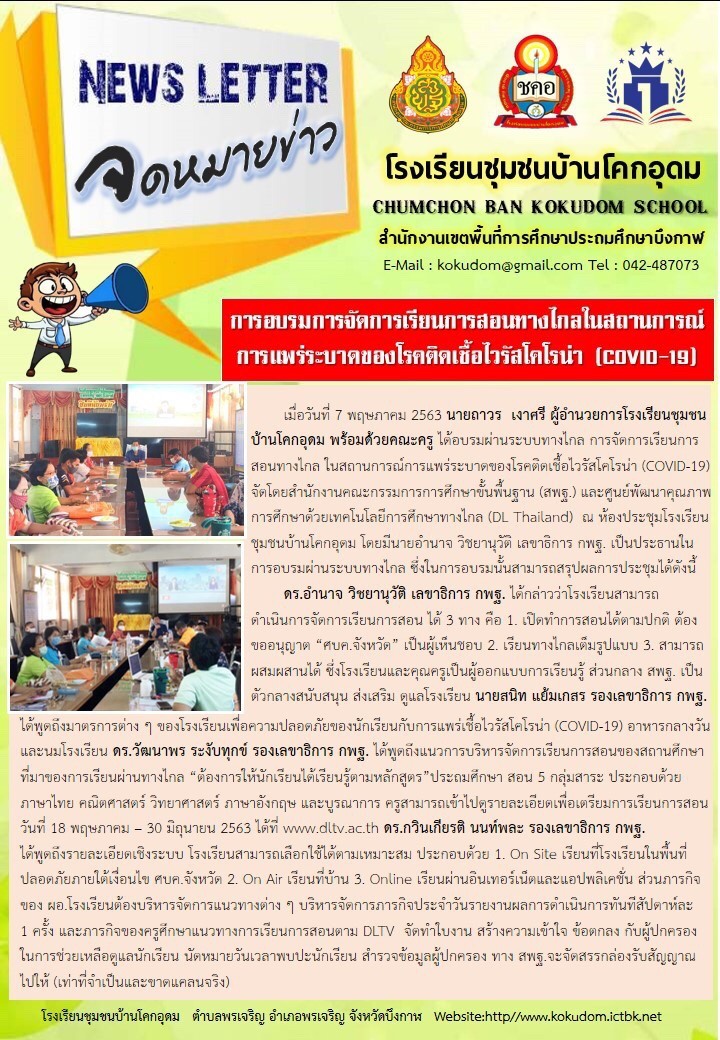 จดหมายข่าว การอบรมการจัดการเรียนการสอนทางไกลในสถานการณ์แพร่ระบาดของโรคโคโรนา ๒๐๑๙ (COVID-๑๙) ผ่านระบบการประชุมทางไกล Video Conference รร.ชุมชนบ้านโคกอุดม