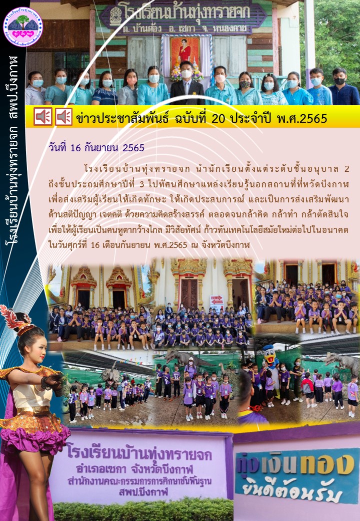 โรงเรียนบ้านทุ่งทรายจก นำนักเรียนตั้งแต่ระดับชั้นอนุบาล 2 ถึงชั้นประถมศึกษาปีที่ 3 ไปทัศนศึกษาแหล่งเรียนรู้นอกสถานที่ที่หวัดบึงกาฬ