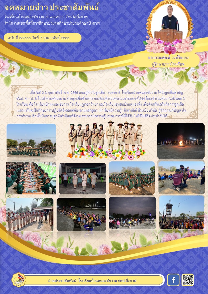 จดหมายข่าวประชาสัมพันธ์ โรงเรียนบ้านหนองชัยวาน กิจกรรมการเข้าค่ายพักแรมลูกเสือ-เนตรนารีสามัญ ประจำปีการศึกษา 2565