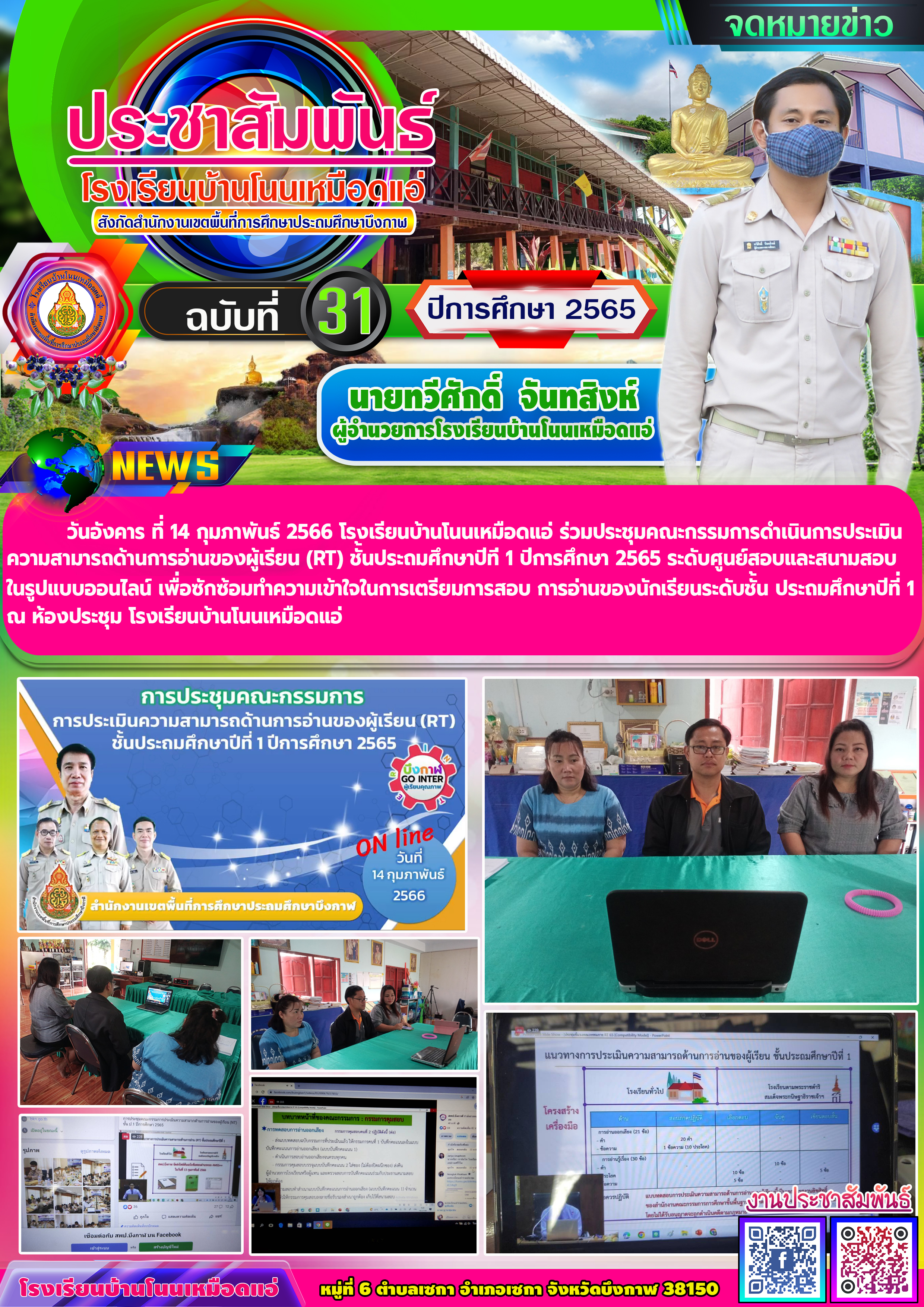 โรงเรียนบ้านโนนเหมือดแอ่ ขอประชาสัมพันธ์จดหมายข่าว ฉบับที่ 31 ปีการศึกษา 2565 การประชุมคณะกรรมการดำเนินการประเมินความสามารถด้านการอ่านของผู้เรียน (RT) ชั้นประถมศึกษาปีที่ ๑ ปีการศึกษา ๒๕๖๕ ระดับศูนย์สอบและสนามสอบในรูปแบบออนไลน์