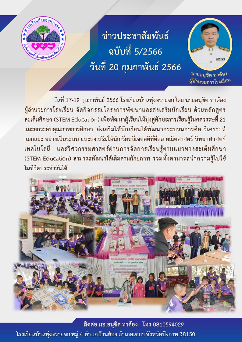 โรงเรียนบ้านทุ่งทรายจก ประชาสัมพันธ์ ฉบับที่ 5/2566 วันที่ 20 กุมภาพัรธ์ 2566 จัดกิจกรรมโครงการพัฒนาและส่งเสริมนักเรียน ด้วยหลักสูตรสะเต็มศึกษา (STEM Education)