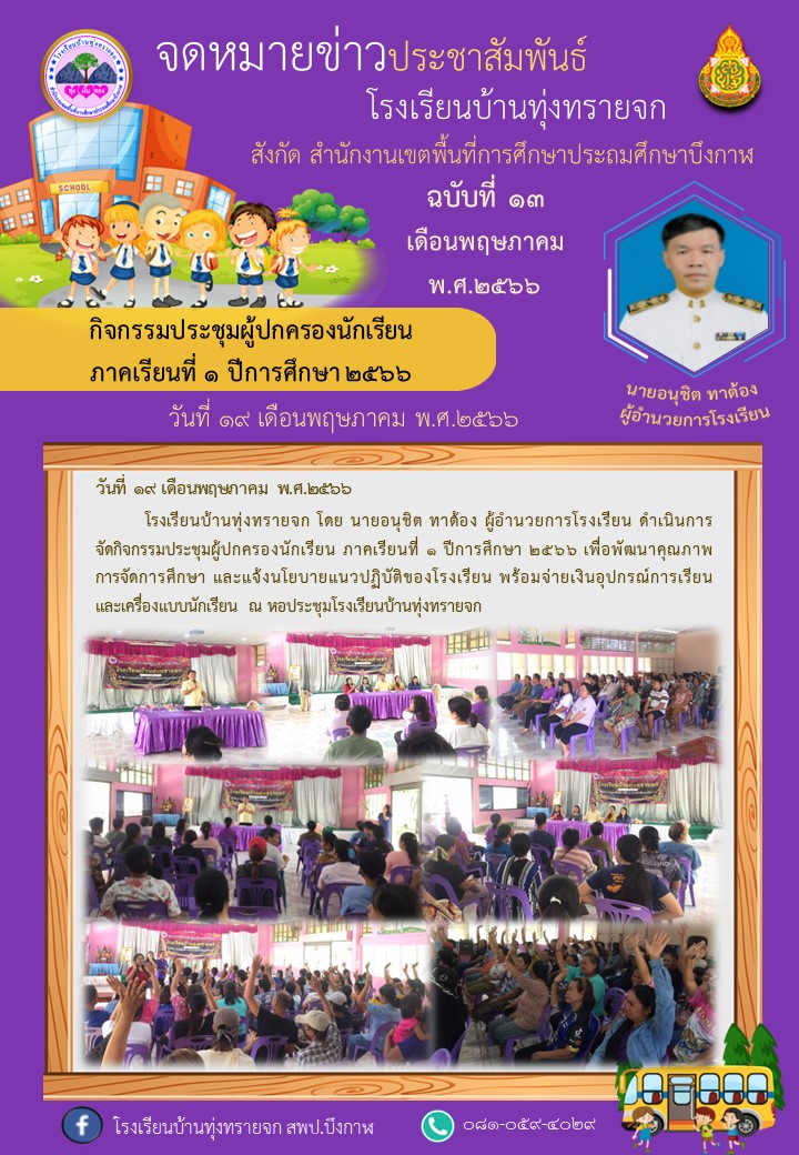 โรงเรียนบ้านทุ่งทรายจก ประชาสัมพันธ์ ฉบับที่ 13/2566 วันที่ 19 พฤษภาคม 2566 จัดกิจกรรมประชุมผู้ปกครองนักเรียน ภาคเรียนที่ ๑ ปีการศึกษา 2566