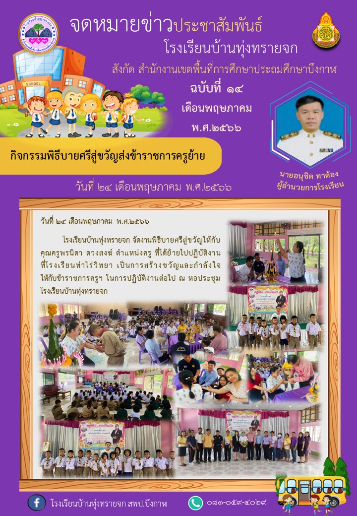 โรงเรียนบ้านทุ่งทรายจก ประชาสัมพันธ์ ฉบับที่ 14/2566 วันที่ 24 พฤษภาคม 2566 จัดงานพิธีบายศรีสู่ขวัญส่งข้าราชการครูย้าย