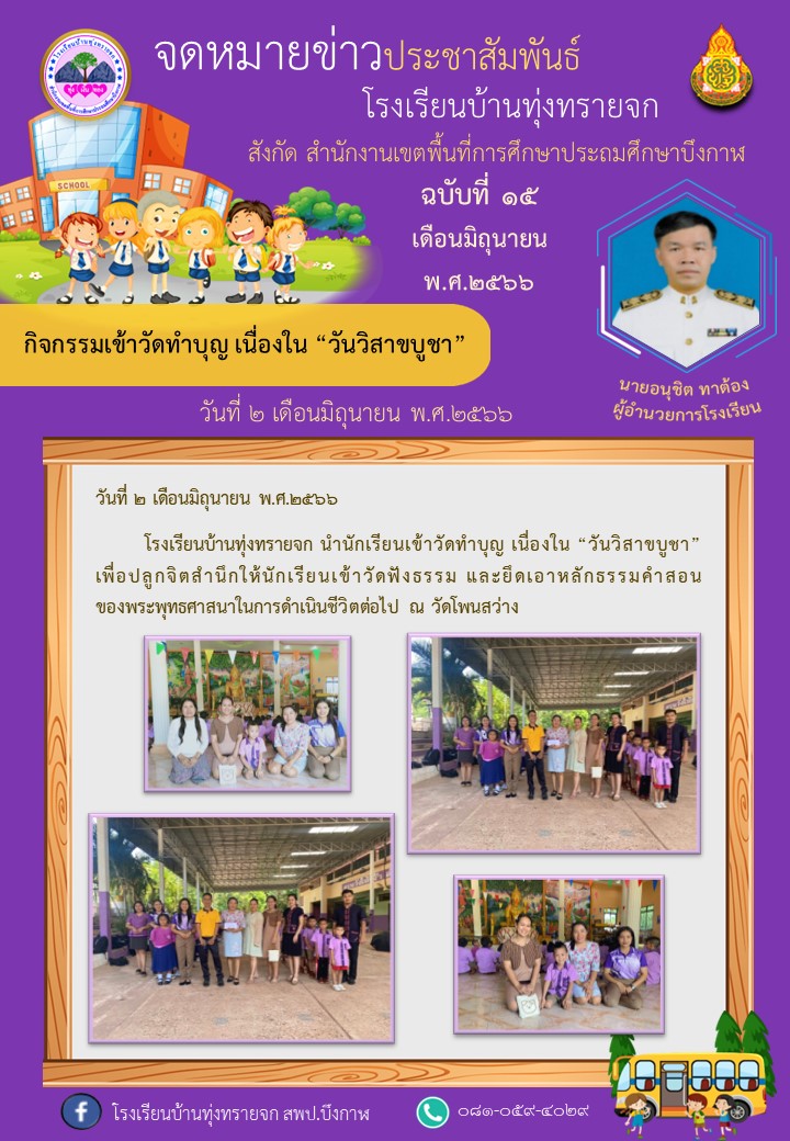 โรงเรียนบ้านทุ่งทรายจก ประชาสัมพันธ์ ฉบับที่ 15/2566 วันที่ 2 มิถุนายน 2566 กิจกรรมเข้าวัดทำบุญ เนื่องใน “วันวิสาขบูชา”