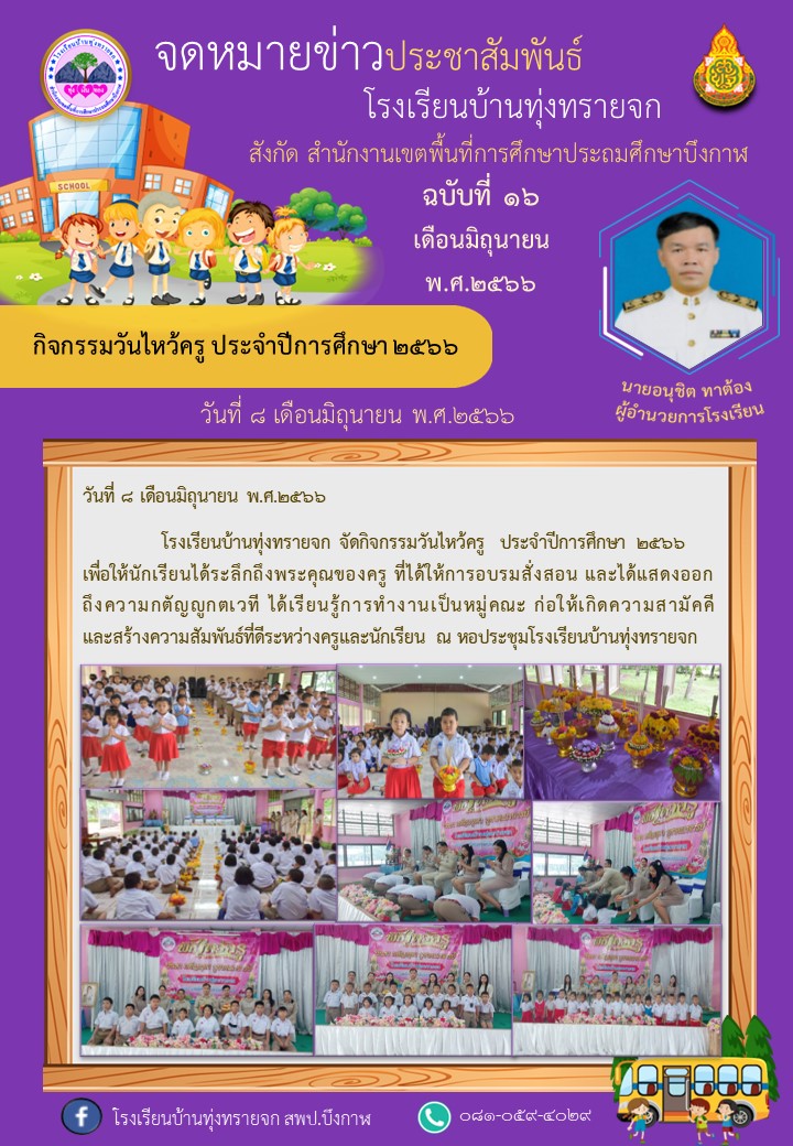 โรงเรียนบ้านทุ่งทรายจก ประชาสัมพันธ์ ฉบับที่ 16/2566 วันที่ 8 มิถุนายน 2566 กิจกรรมวันไหว้ครู ประจำปีการศึกษา ๒๕๖๖