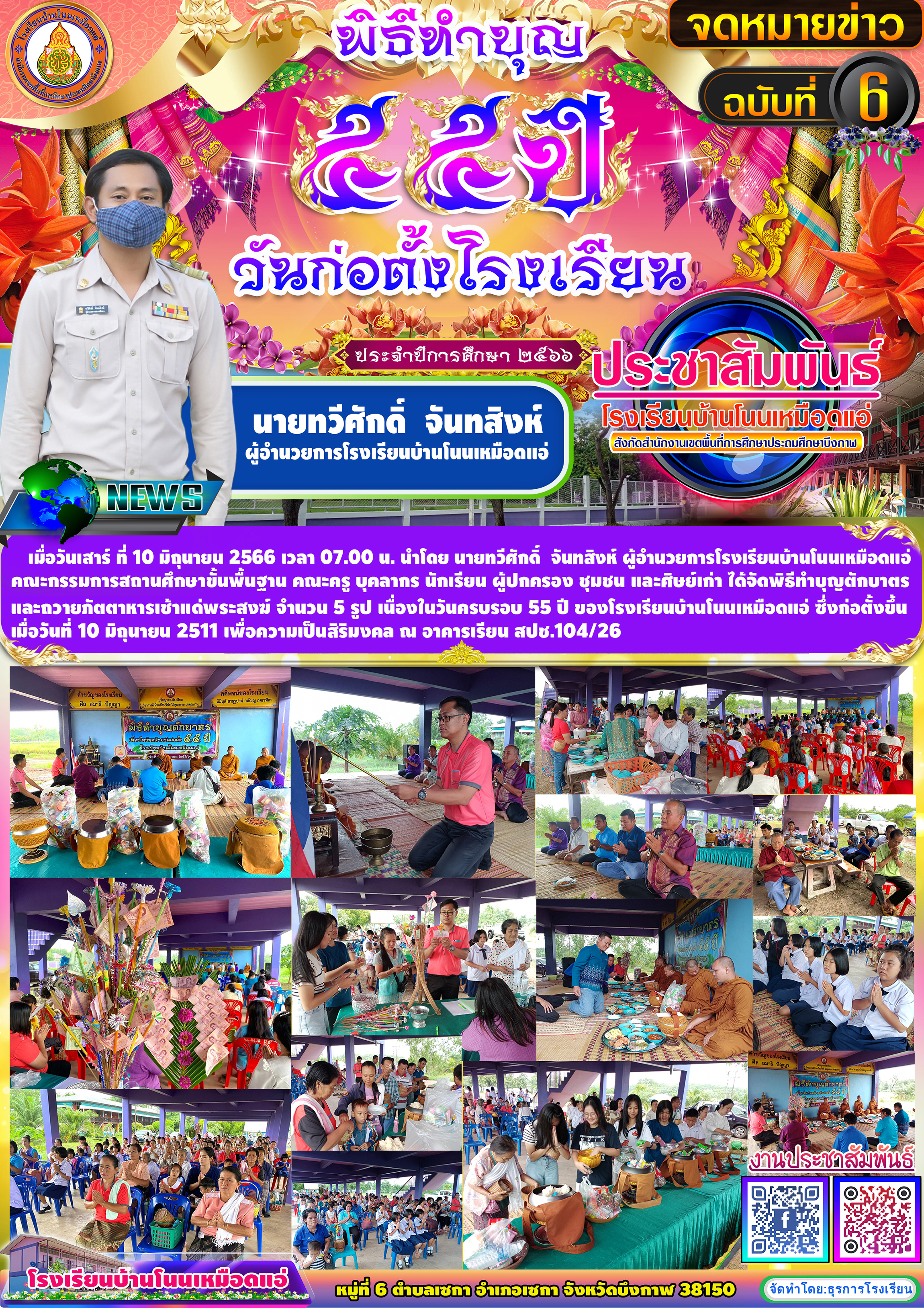 โรงเรียนบ้านโนนเหมือดแอ่ ขอประชาสัมพันธ์จดหมายข่าว ฉบับที่ 6 ปีการศึกษา 2566 พิธีทำบุญตักบาตร เนื่องในวันครบรอบ 55 ปี โรงเรียนบ้านโนนเหมือดแอ่