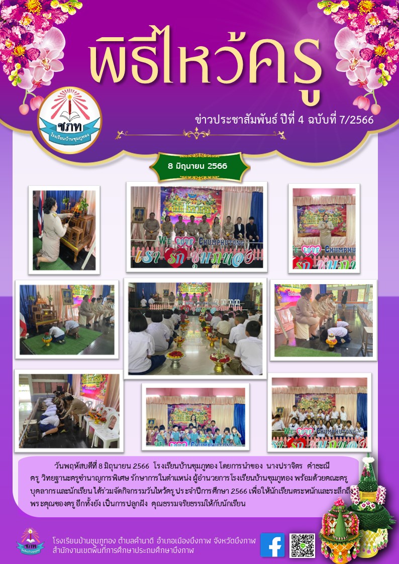 วันพฤหัสบดีที่ 8 มิถุนายน 2566 โรงเรียนบ้านชุมภูทอง โดยการนำของ นางปราจิตร คำธะณี ครู วิทยฐานะครูชำนาญการพิเศษ รักษาการในตำแหน่ง ผู้อำนวยการโรงเรียนบ้านชุมภูทอง พร้อมด้วยคณะครูบุคลากรและนักเรียน ได้ร่วมจัดกิจกรรมวันไหว้ครู ประจำปี