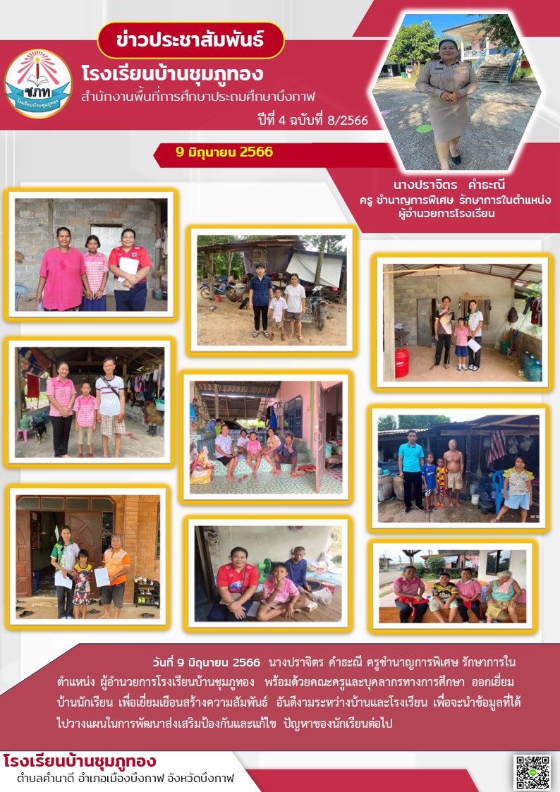 วันที่ 9 มิถุนายน 2566 นางปราจิตร คำธะณี ครูชำนาญการพิเศษ รักษาการในตำแหน่ง ผู้อำนวยการโรงเรียนบ้านชุมภูทอง พร้อมด้วยคณะครูและบุคลากรทางการศึกษา ออกเยี่ยมบ้านนักเรียน เพื่อเยี่ยมเยือนสร้างความสัมพันธ์ อันดีงามระหว่างบ้านและโรงเรียน เพื่อจะนำข้อมูล